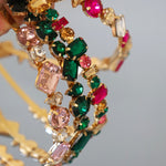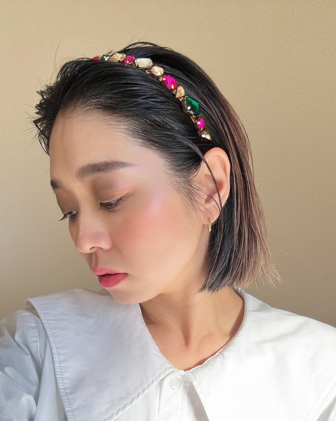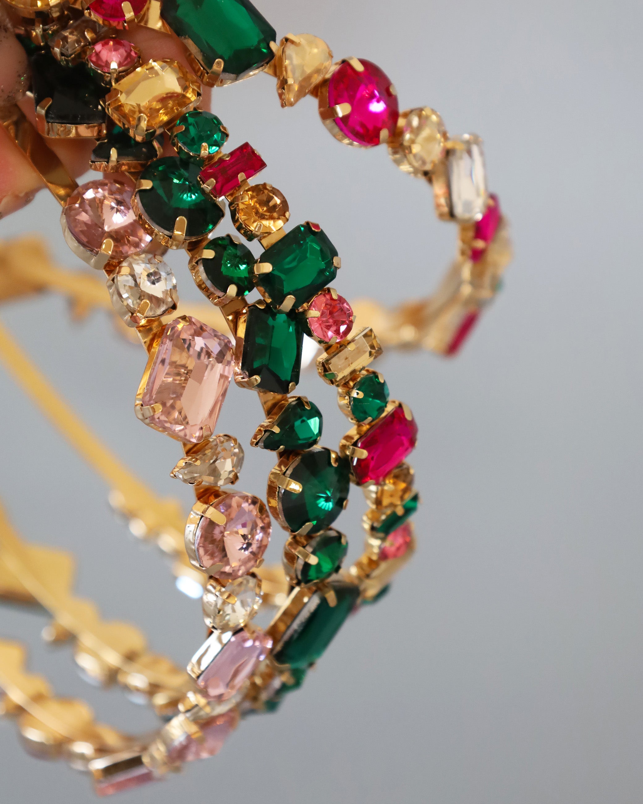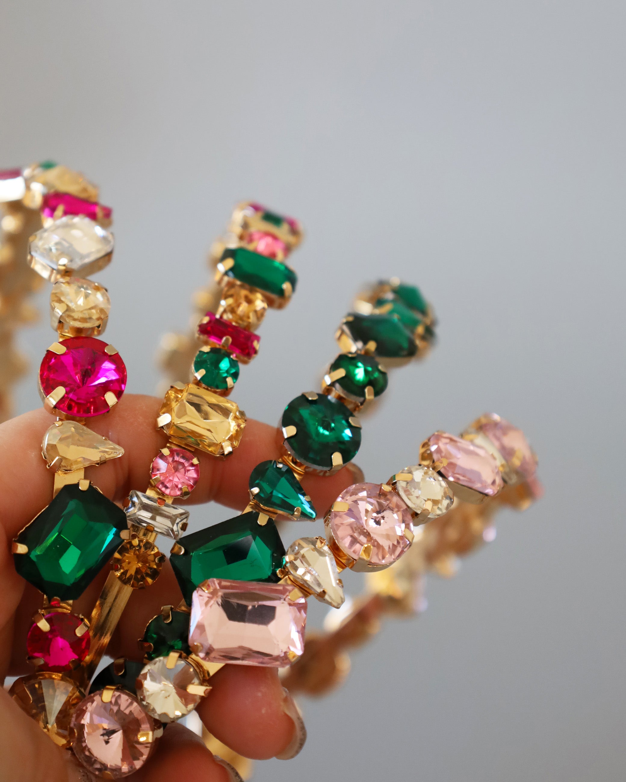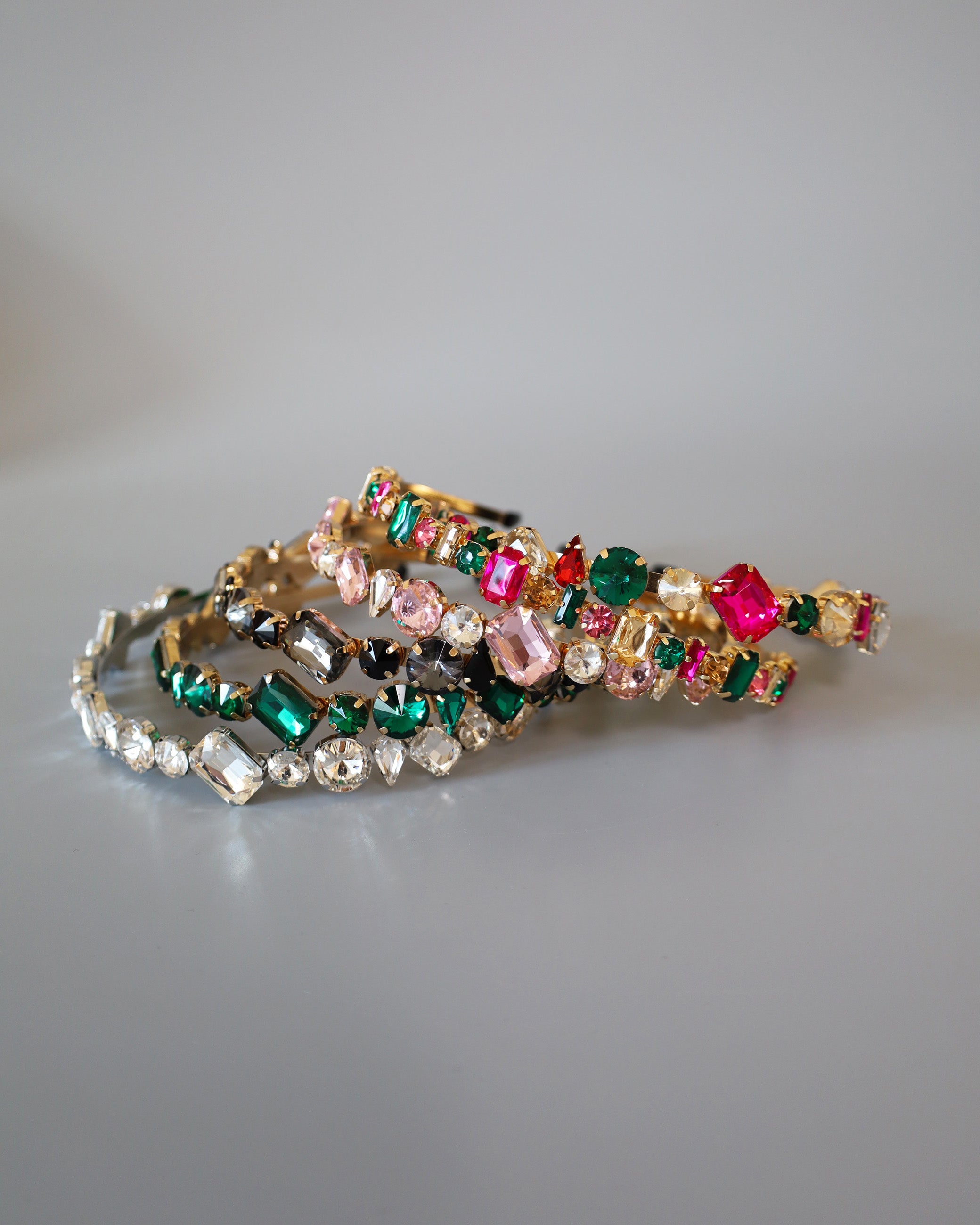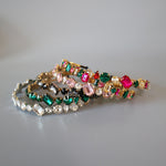 ピンクやグリーンの大粒ビジューがきらめくカラフルカチューシャ。