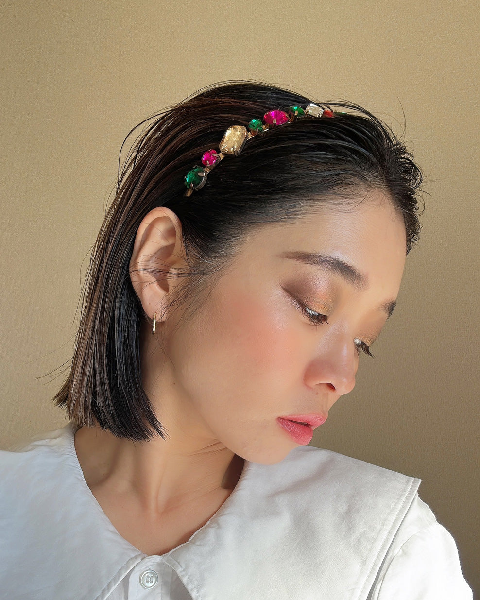 ストレートヘアやタイトアレンジに合わせると大粒のビジューが際立っておすすめ。