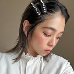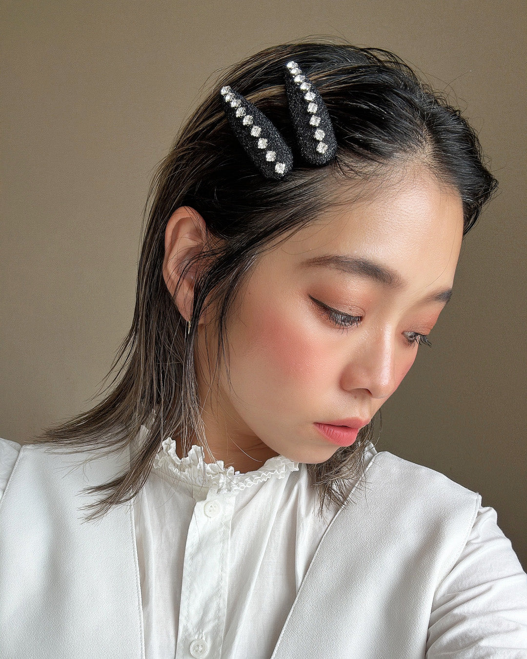 ビジューのきらめきが際立つヘアピンは顔まわりでキラキラさせるのがおすすめ。