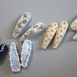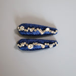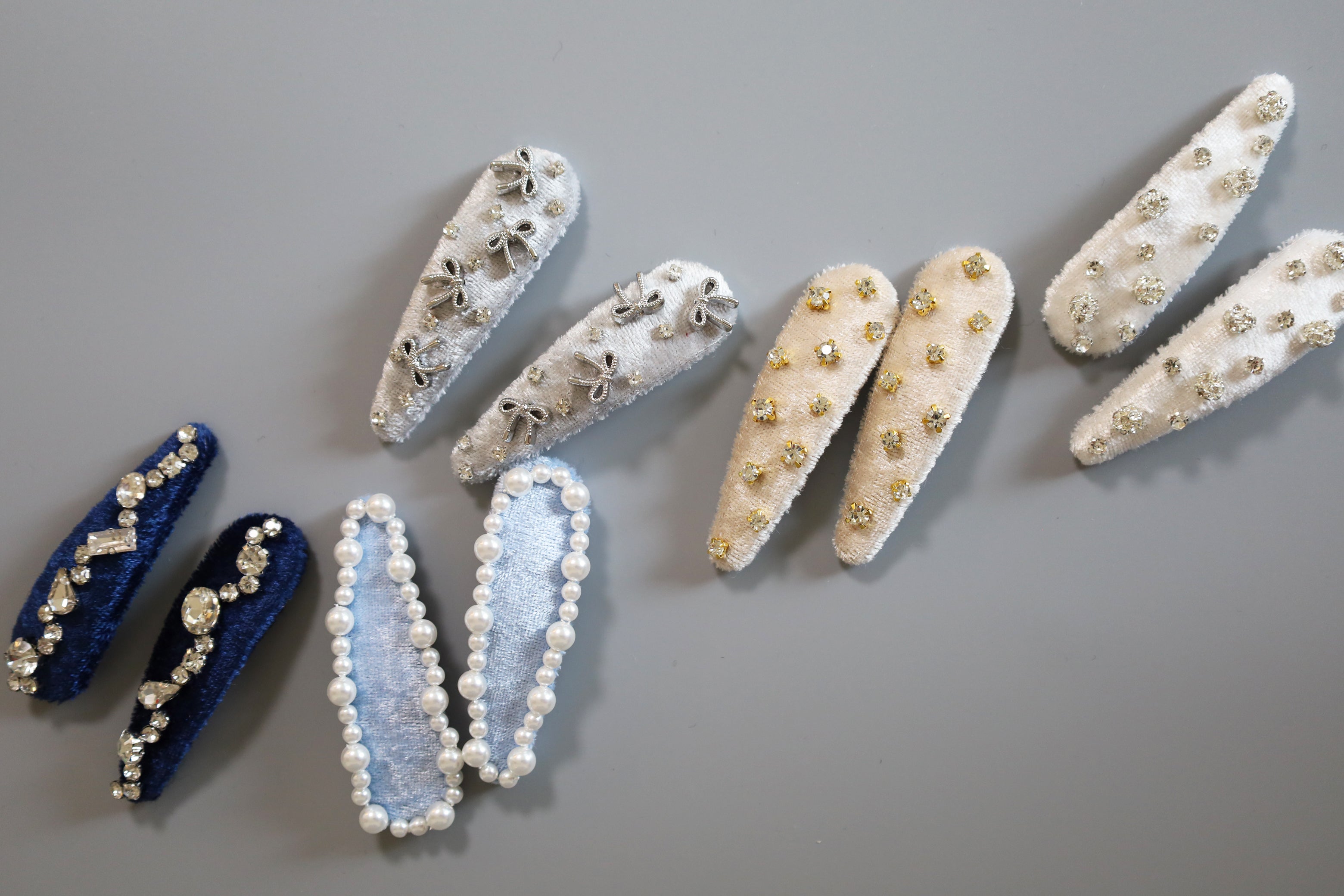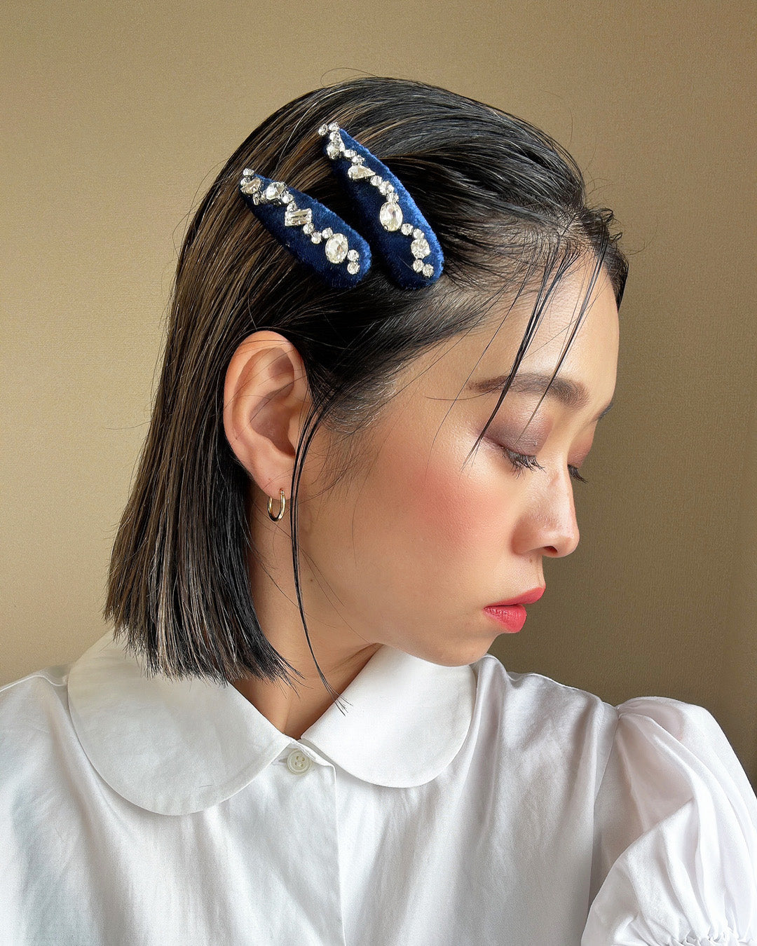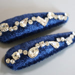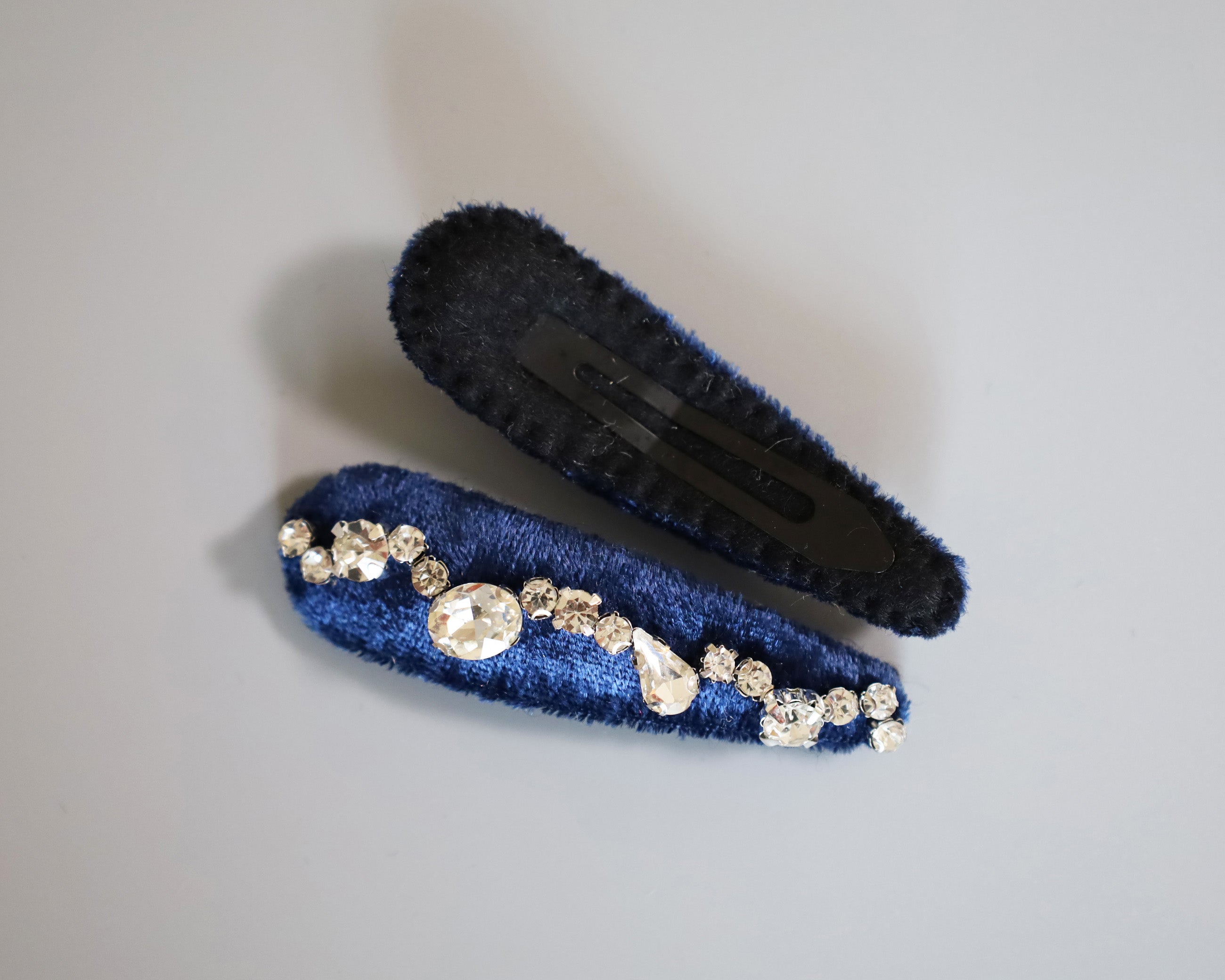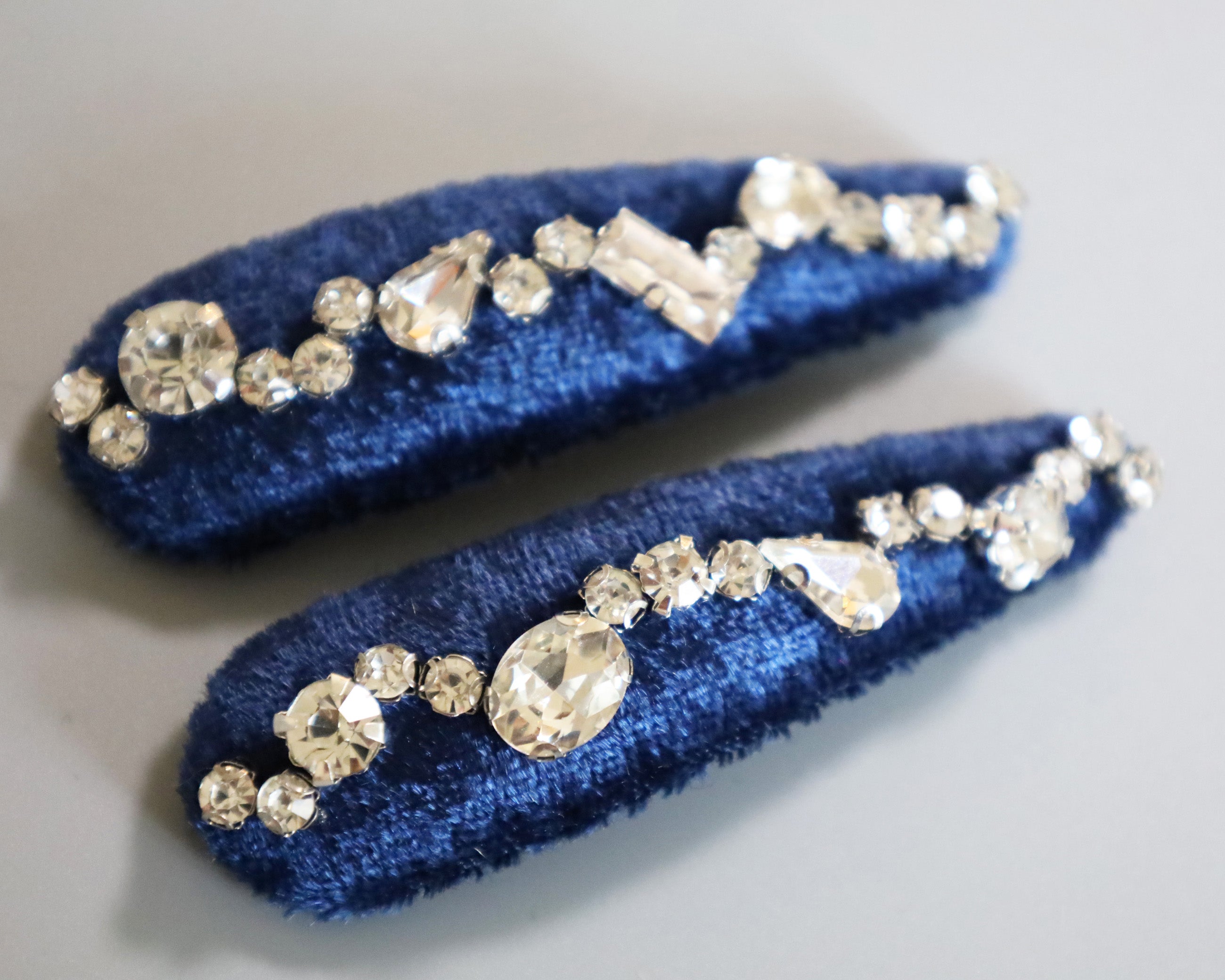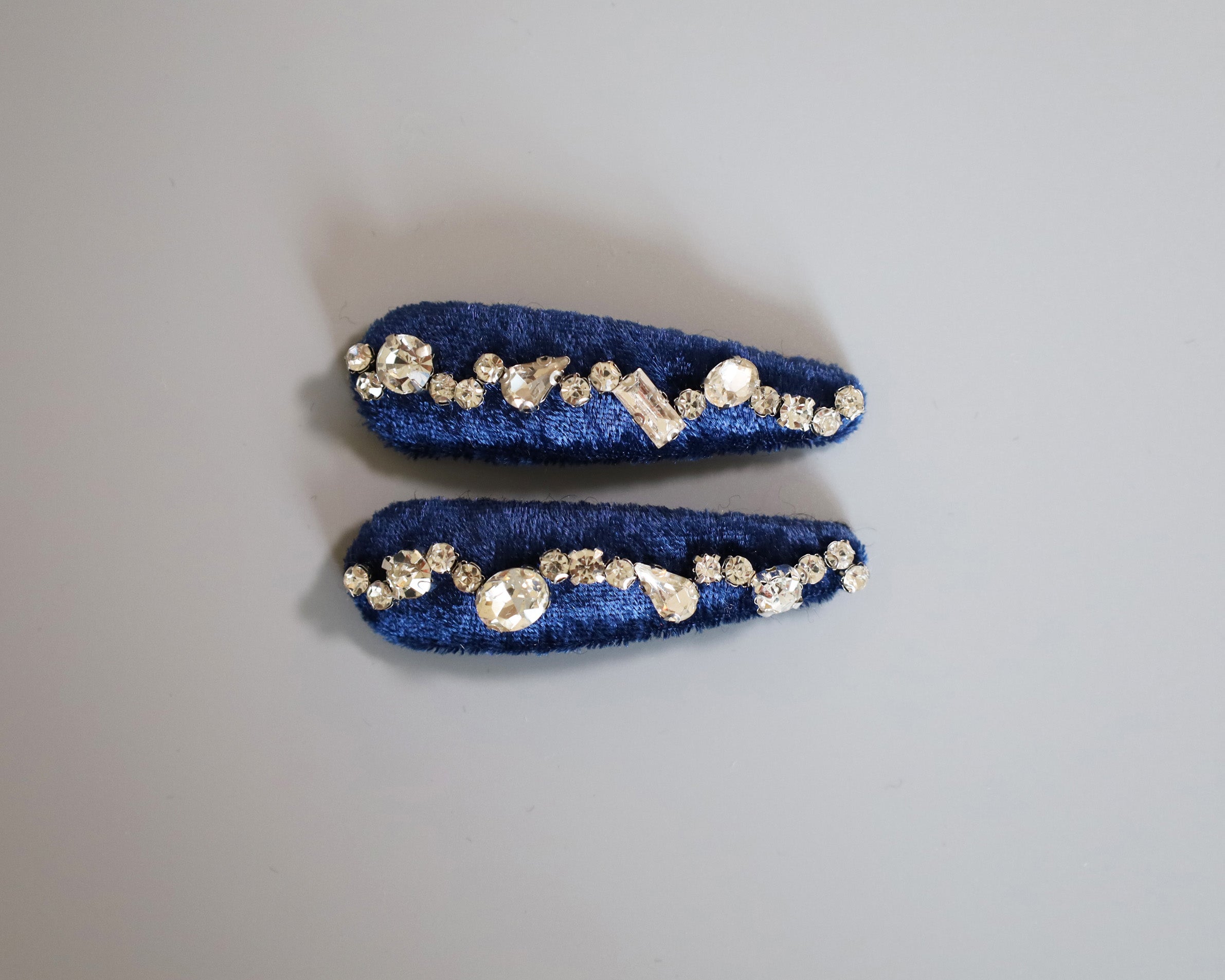 ネイビーのベロアをベースにクリアビジューを並べたエレガントなヘアピン。