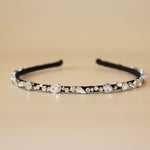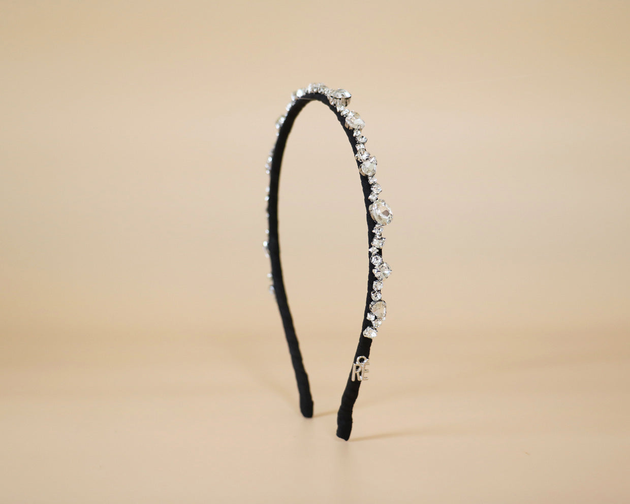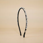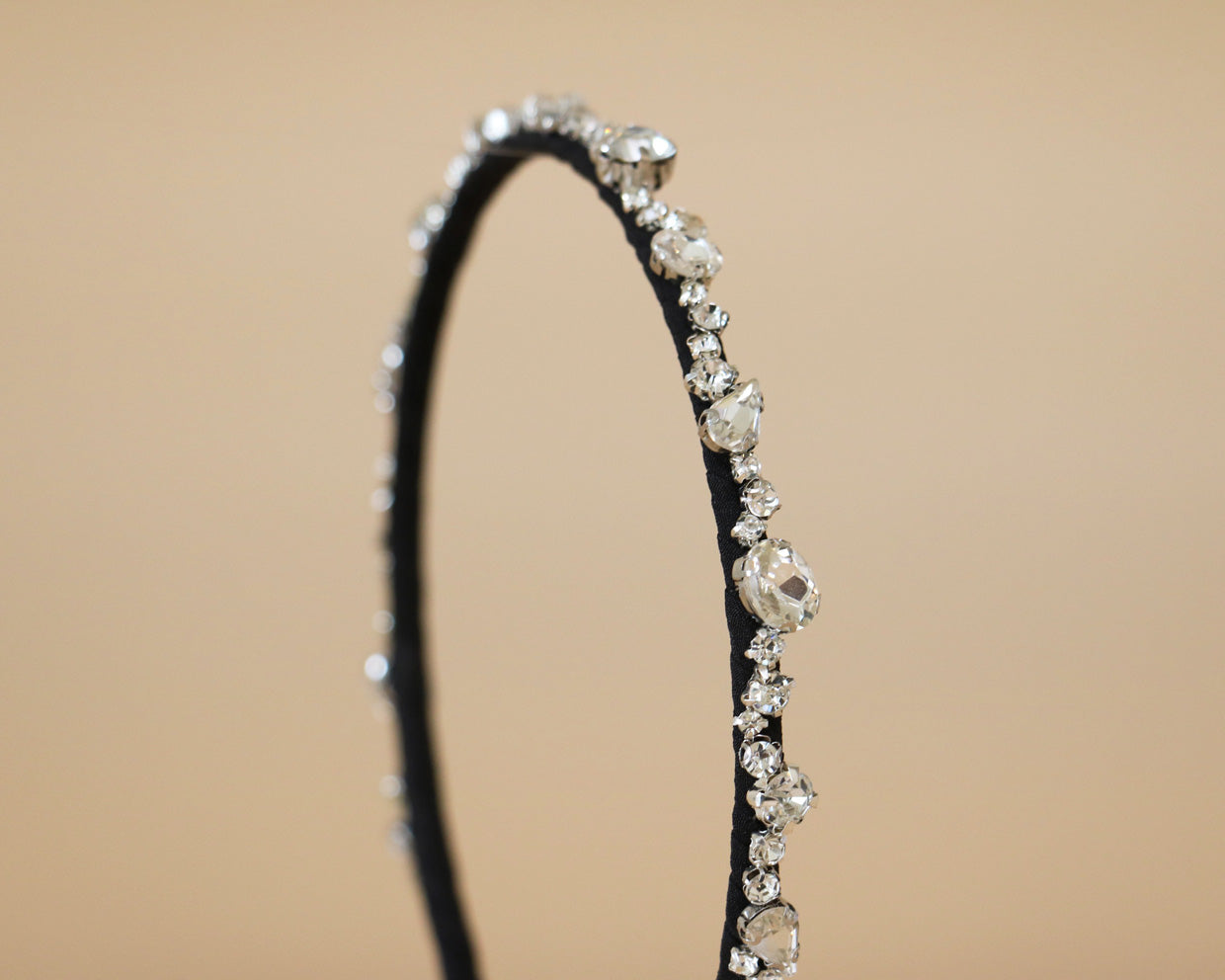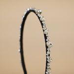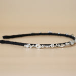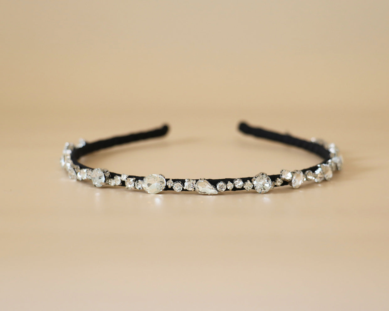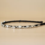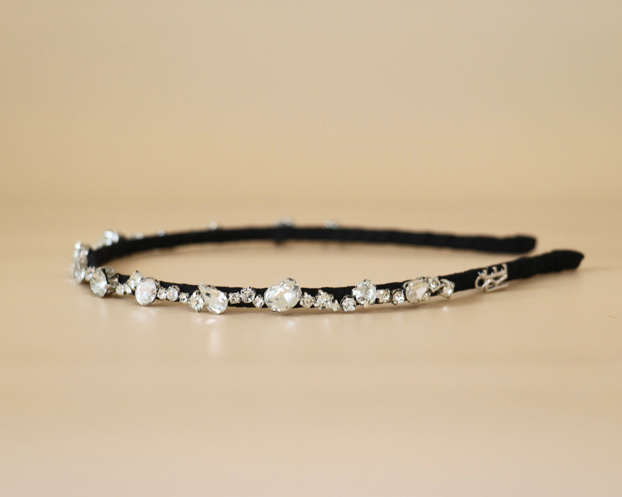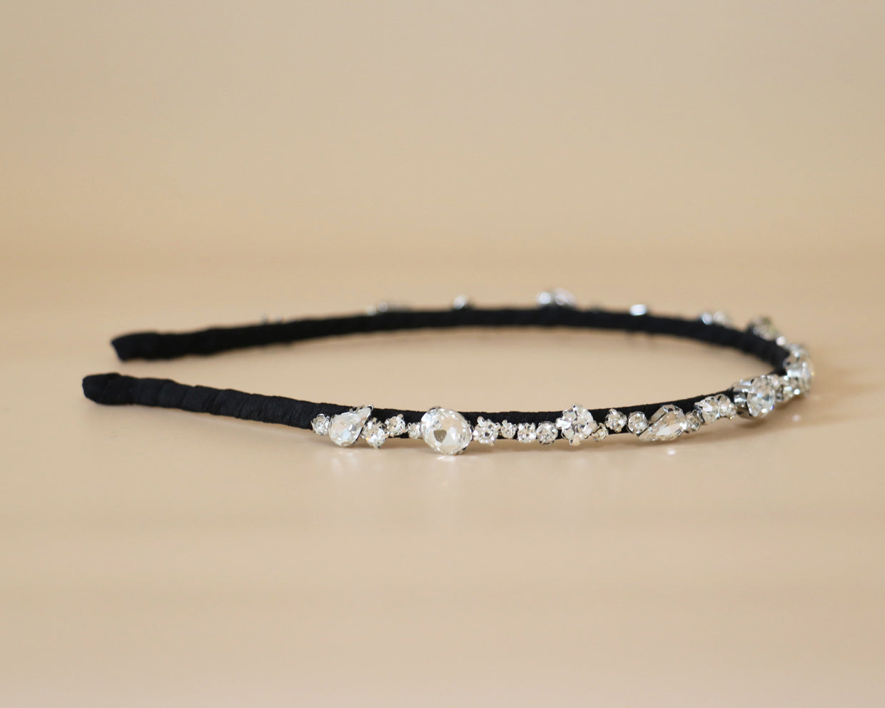 An extremely thin headband made from black silk and adorned with an abundance of jewels.