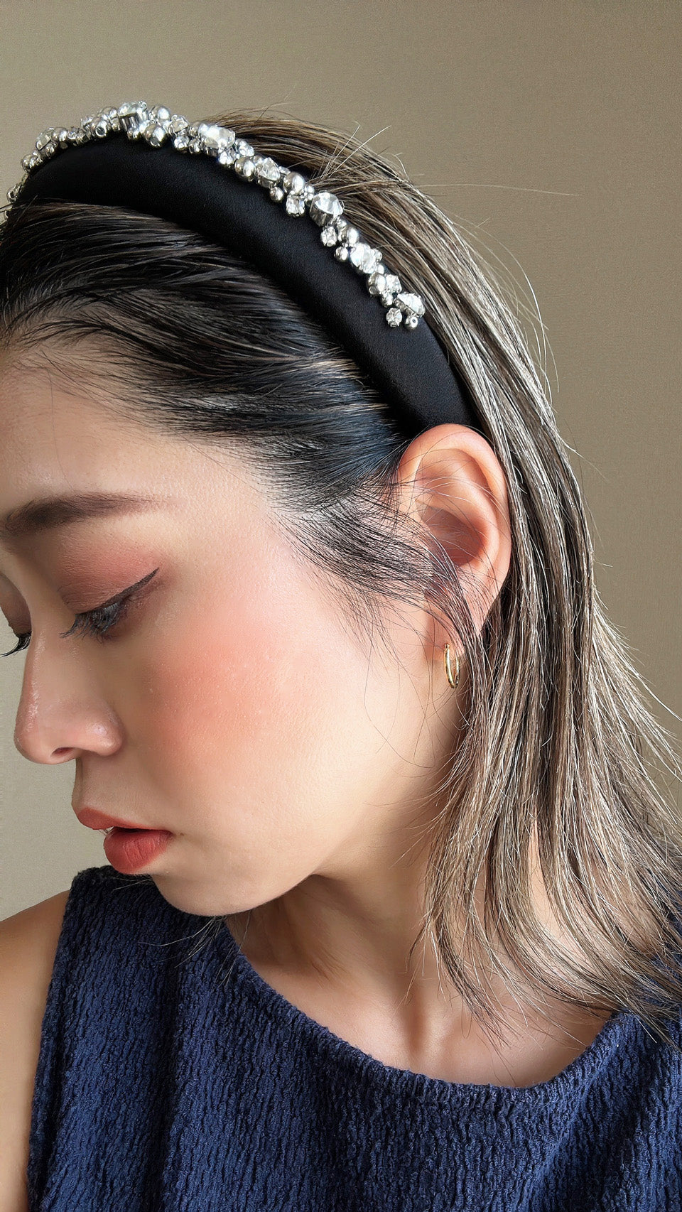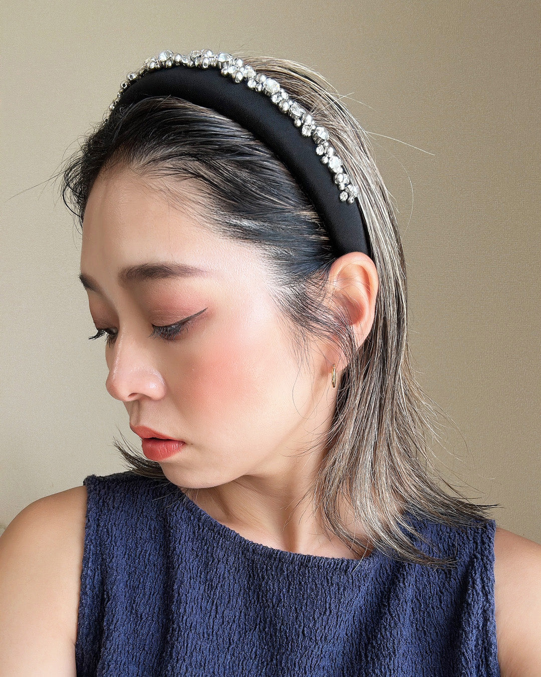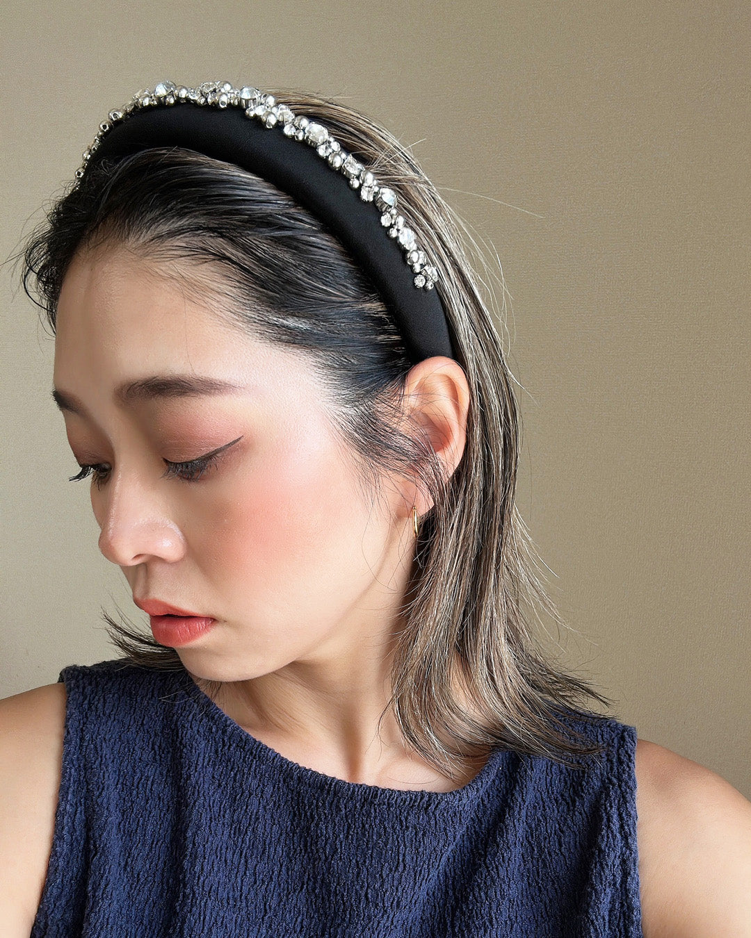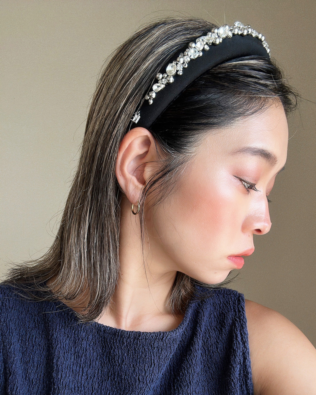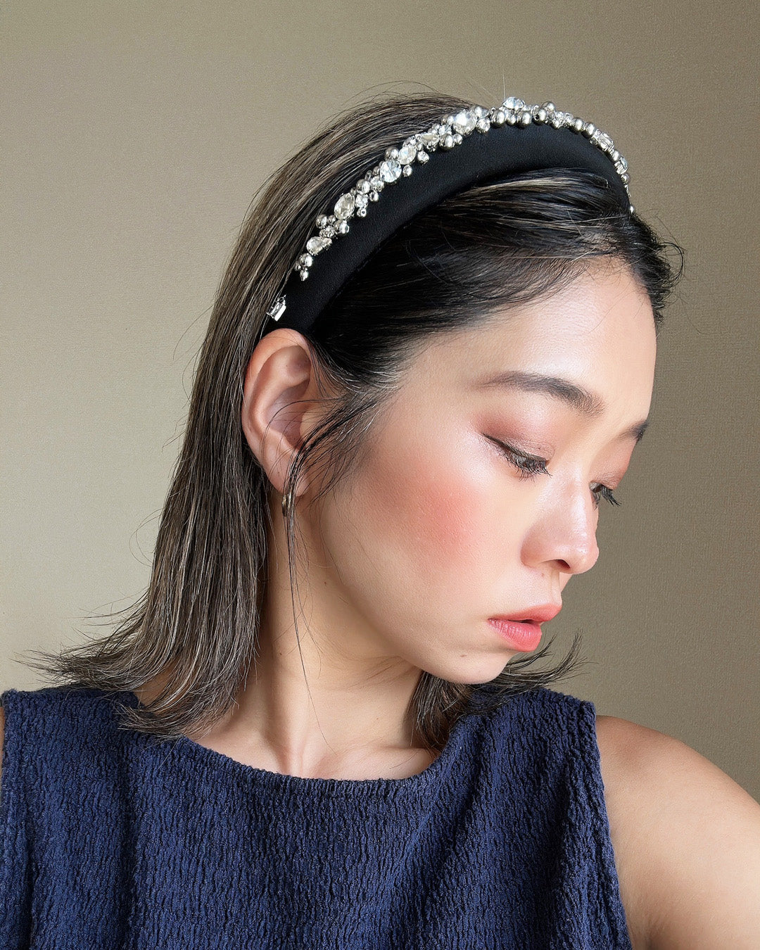 A gorgeous design featuring a simple black headband with plenty of lines of jewels.