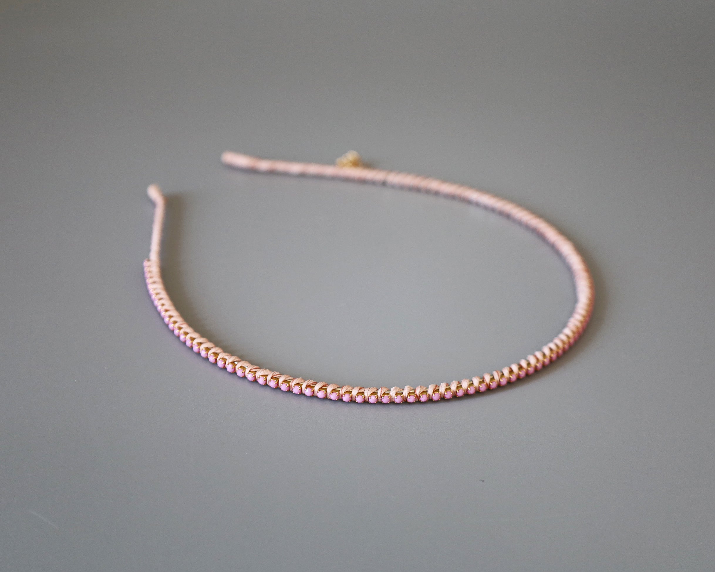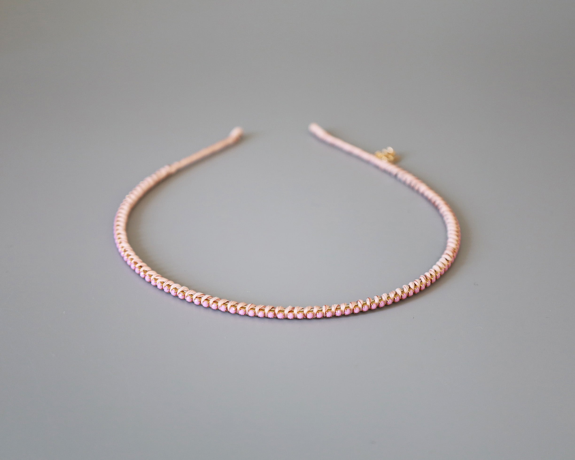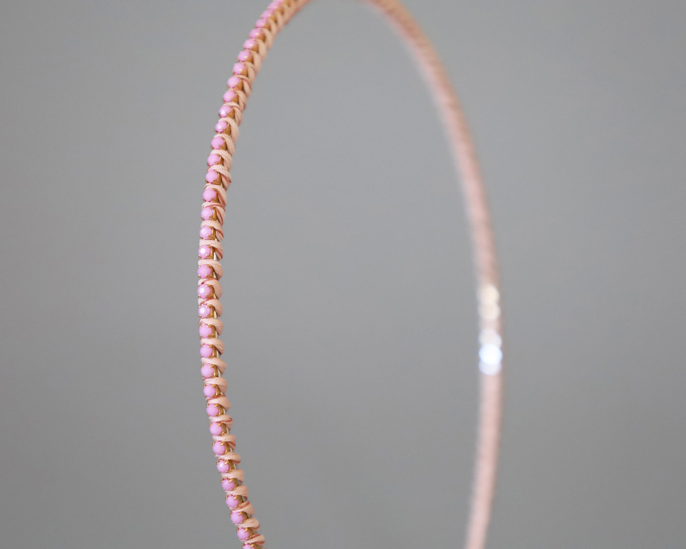 やわらかなペールピンクに同系色のビジューをあしらったカチューシャ。
