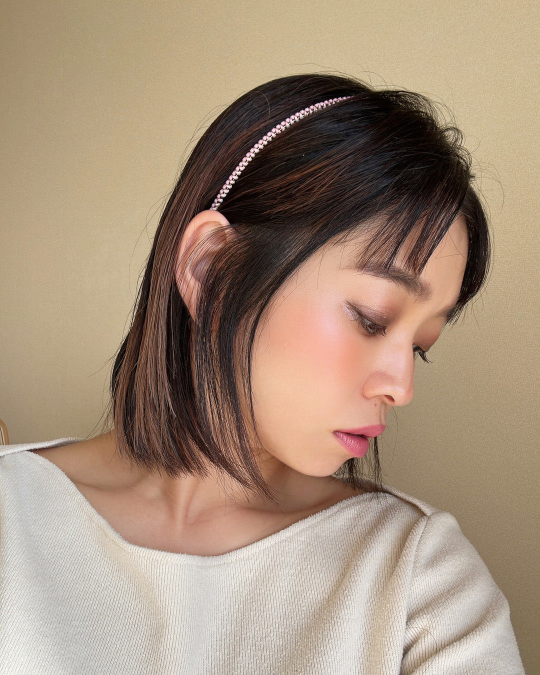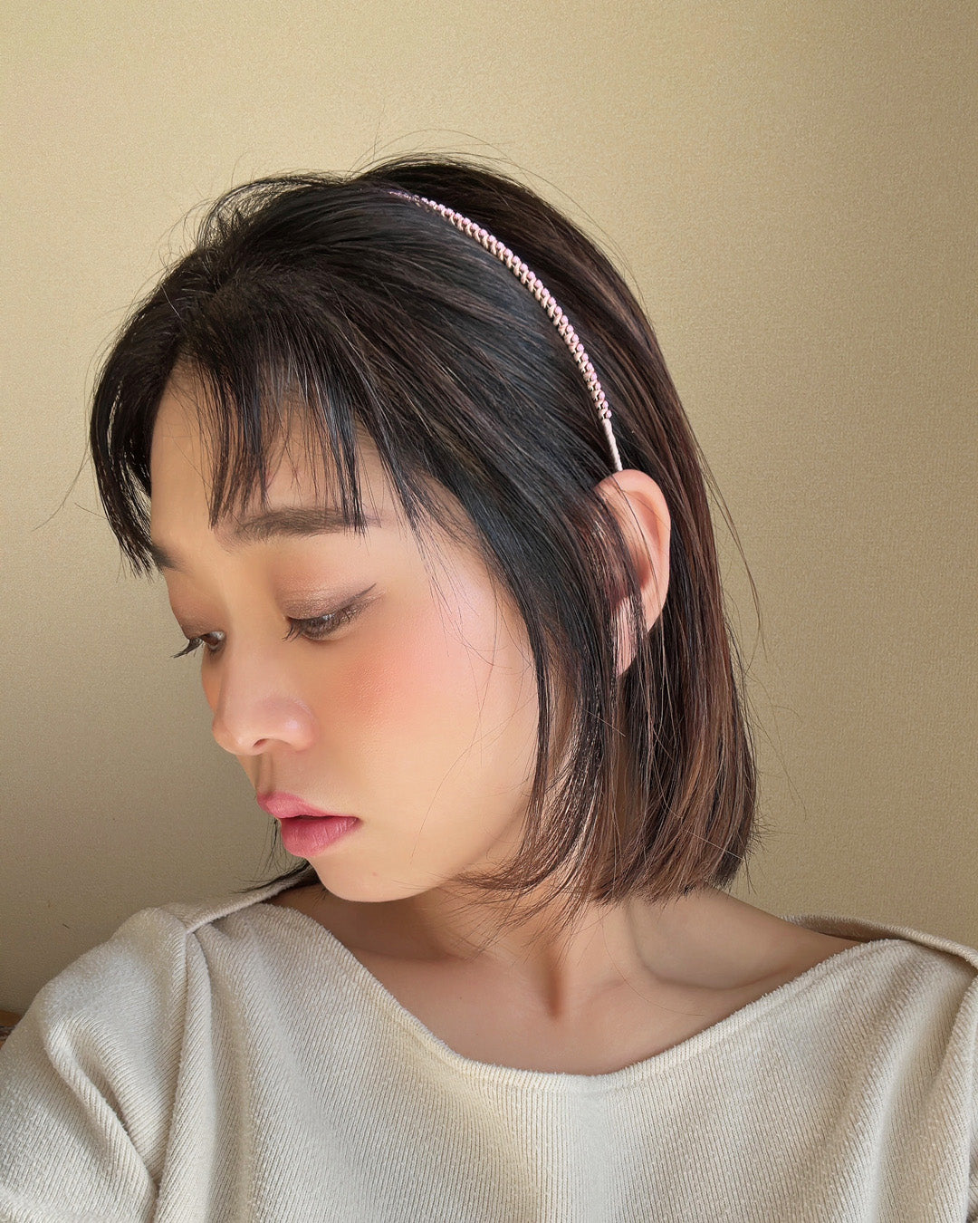 ハイトーンカラーや短めヘアとも相性のいいカチューシャです。