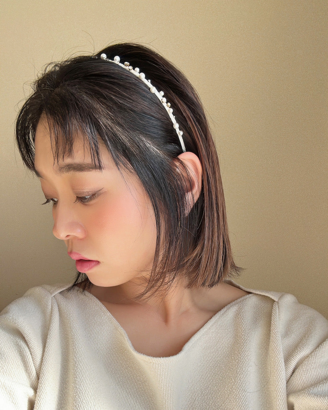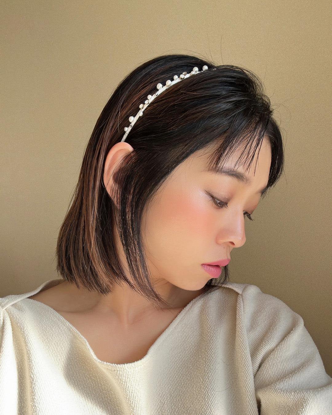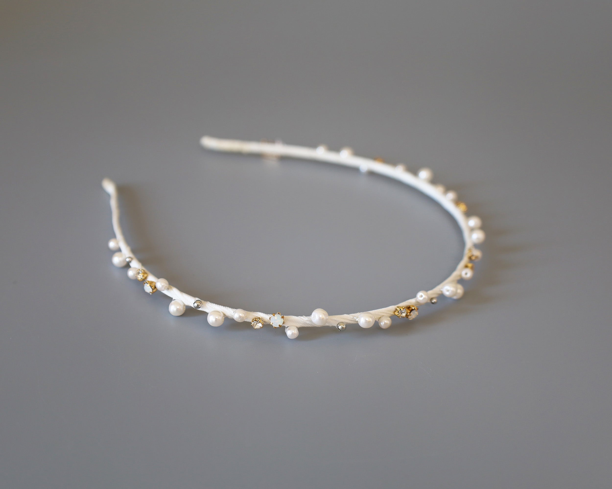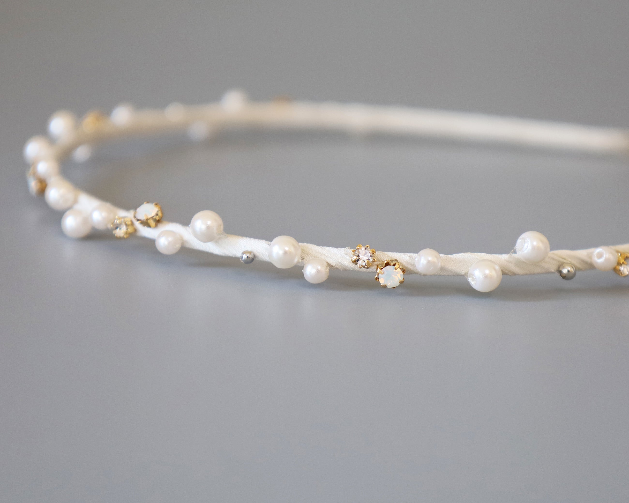 ホワイト×ゴールドが繊細でエレガントなタイトカチューシャ。
