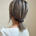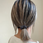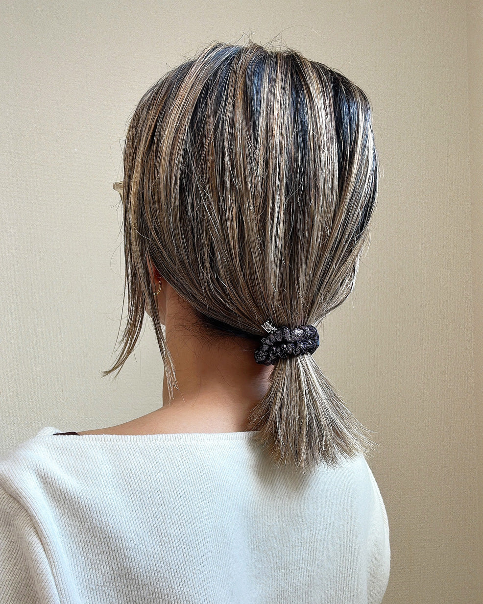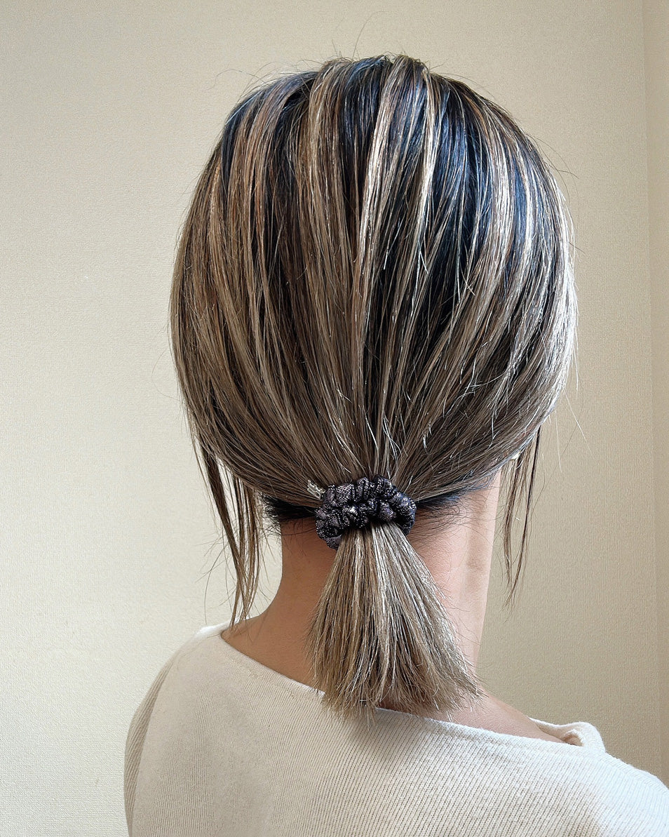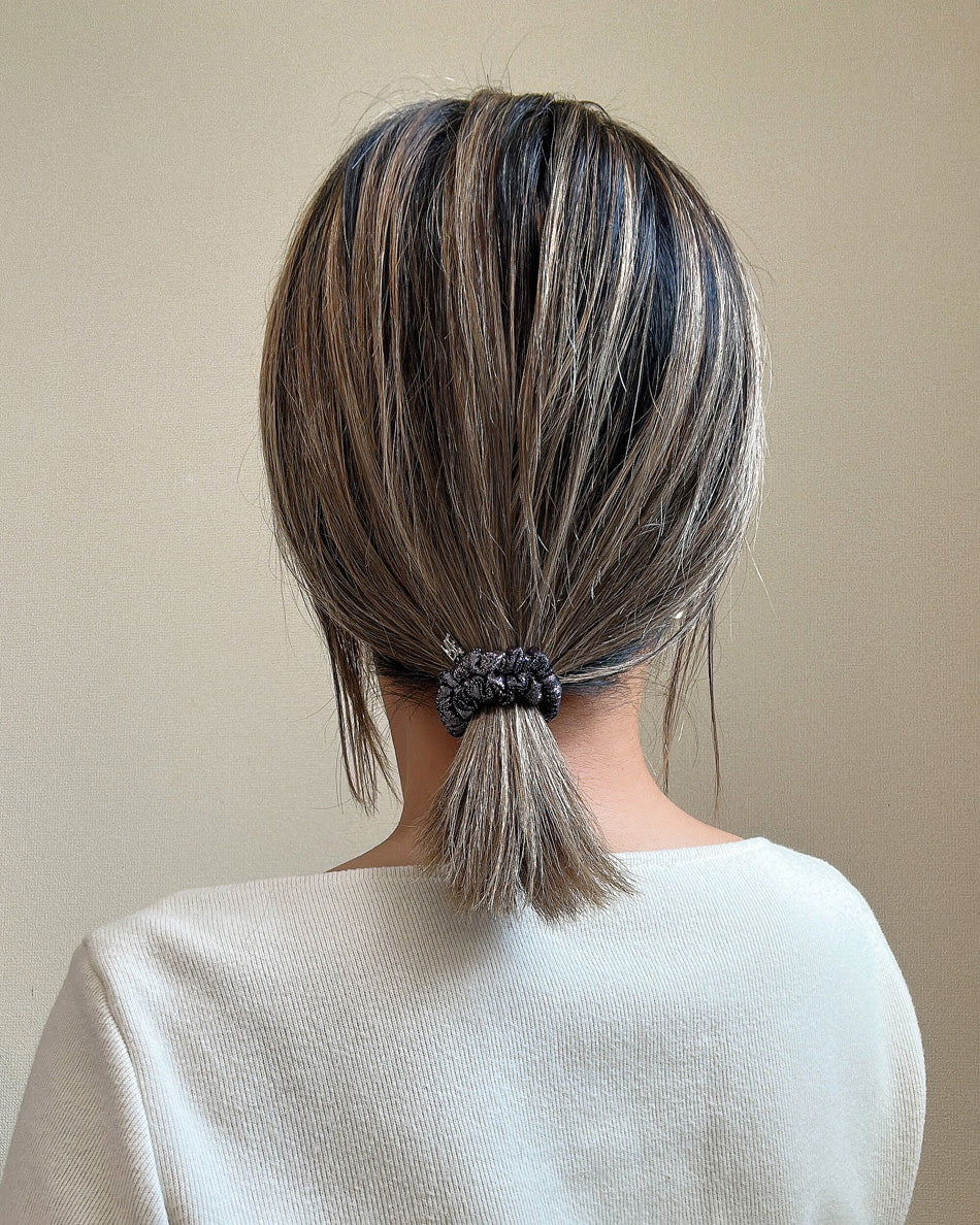 いつも使う普通のヘアゴムをこのシュシュに置き換えるだけで、シンプルなスタイリングも垢抜けスタイルに。