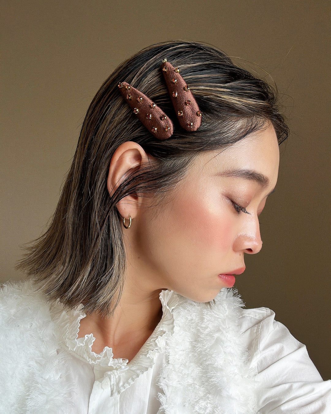 顔まわりにさっとつければ、ビジューのきらめきで表情に華やぎをプラスします。