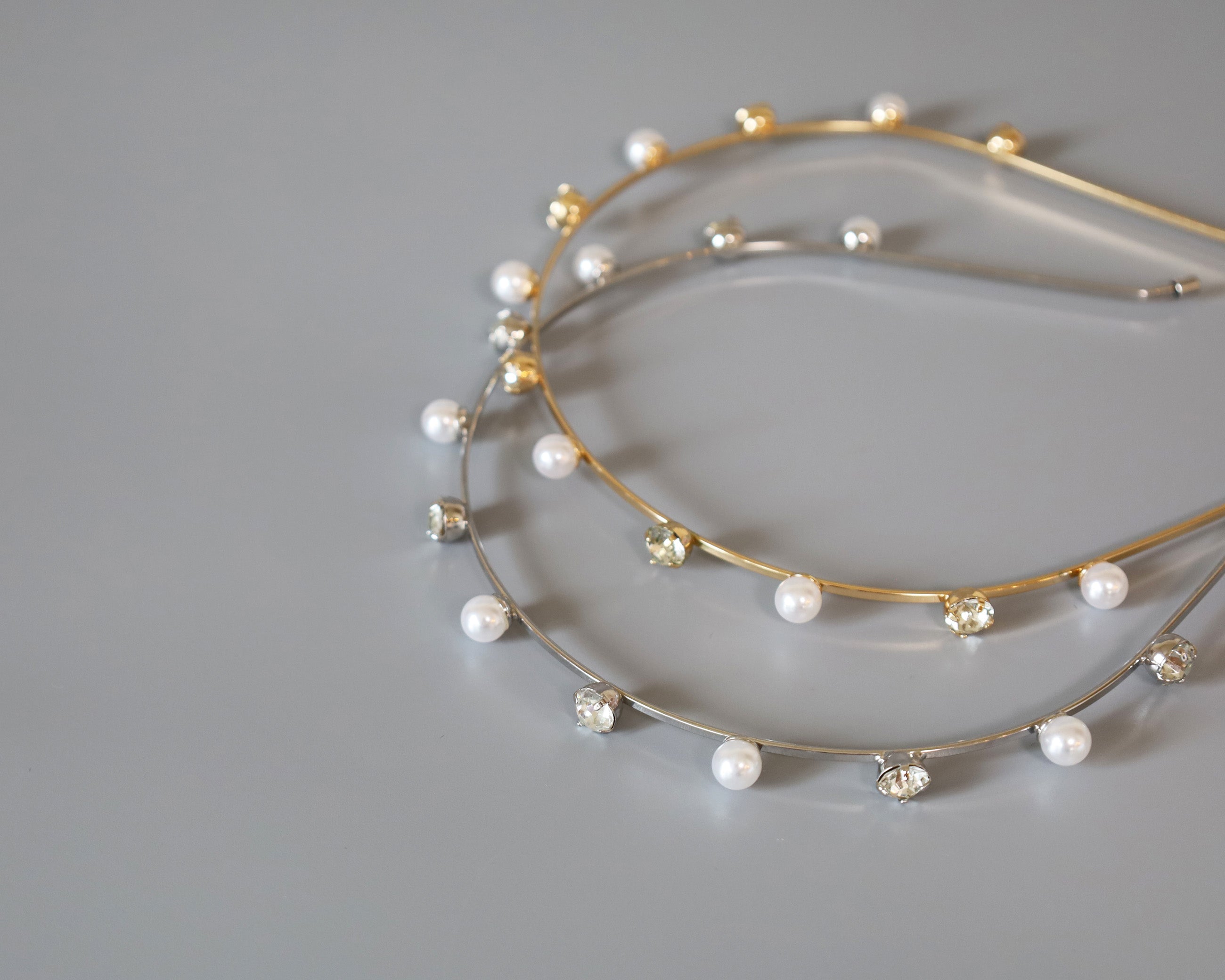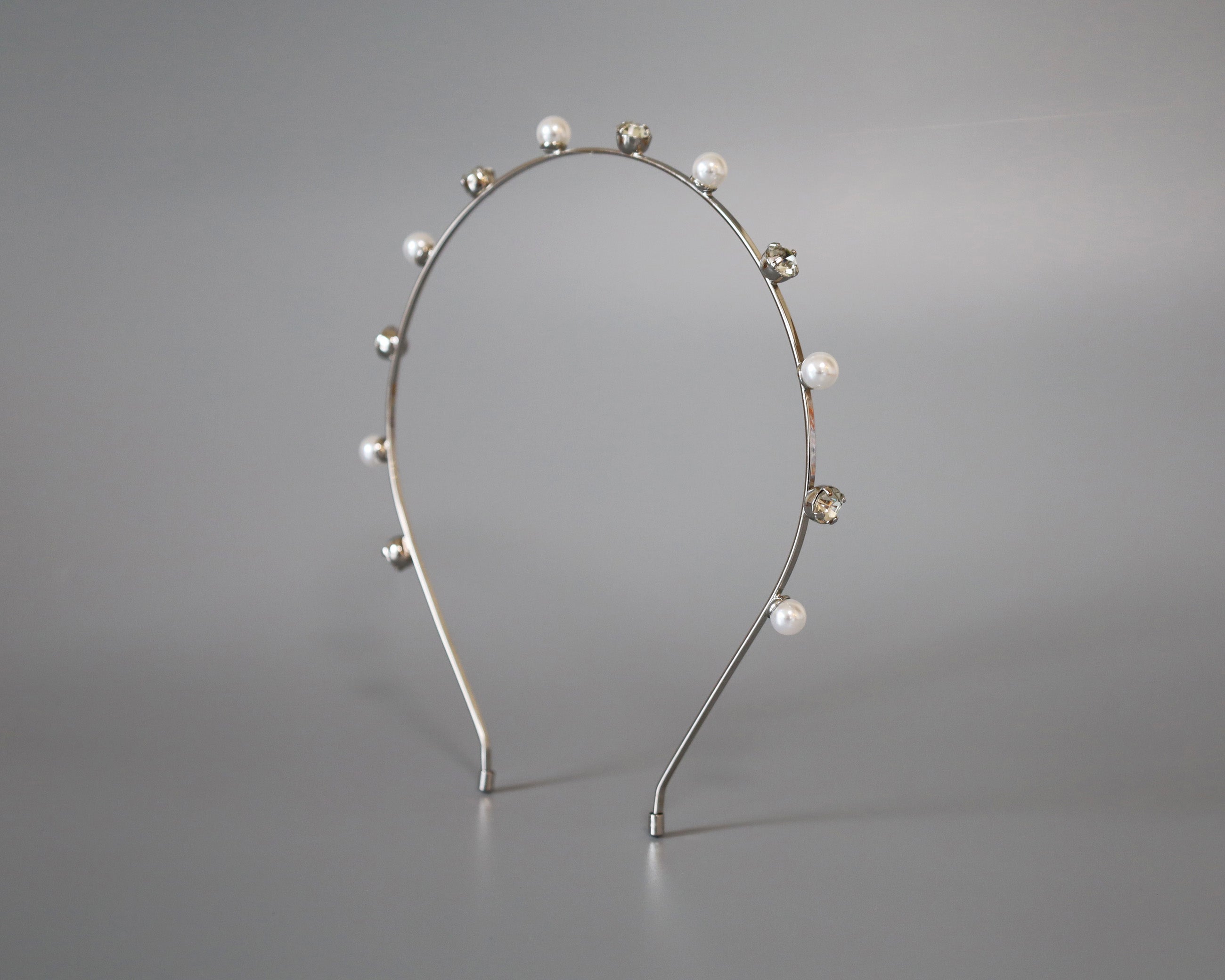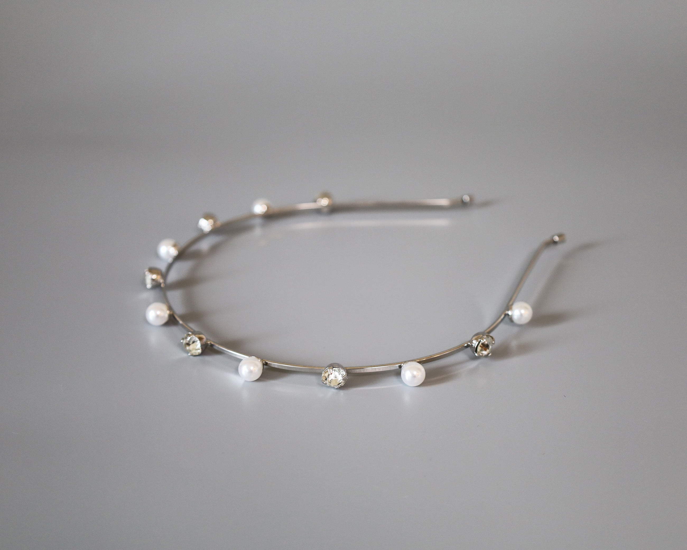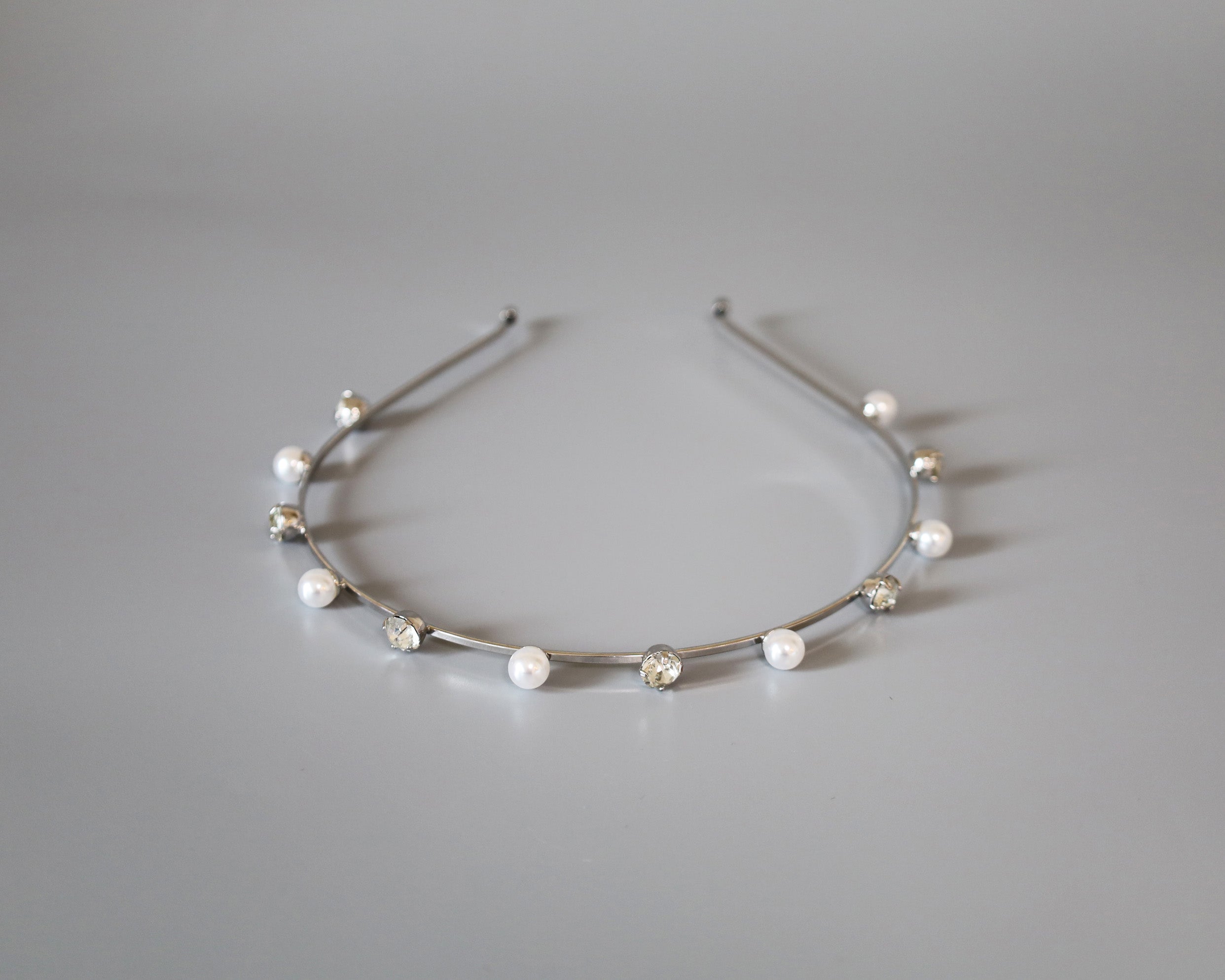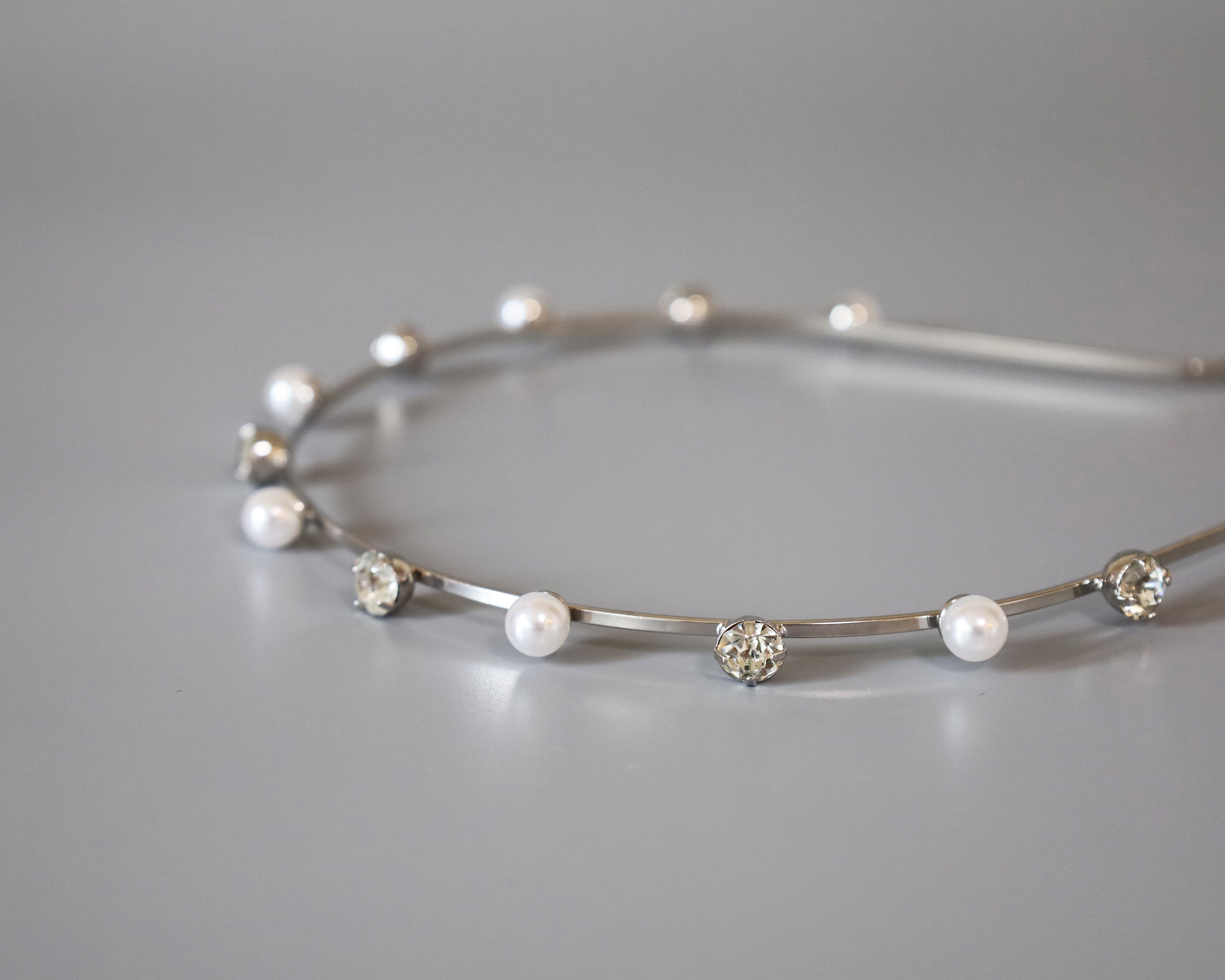 大粒のビジューとパールを交互に配置したスレンダータイプのカチューシャ。