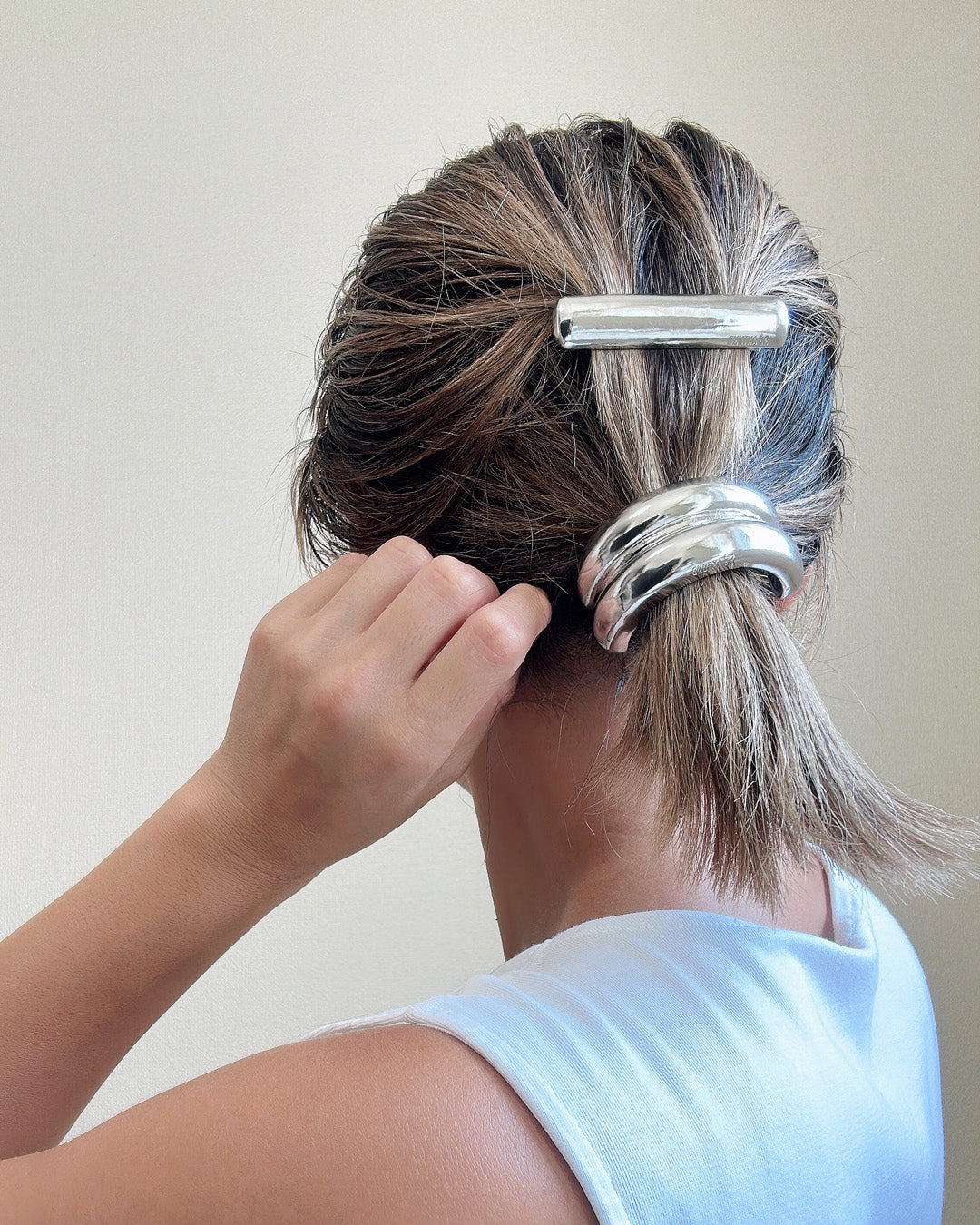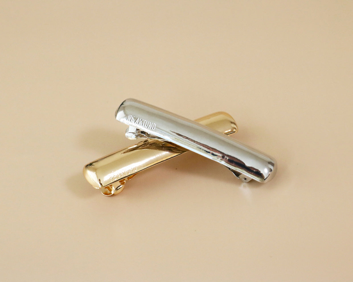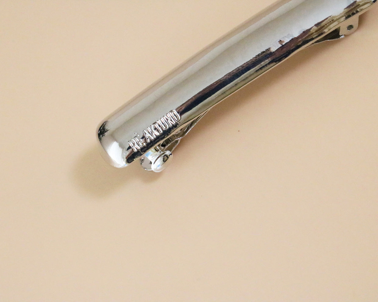 The brand name is engraved on the bottom of the barrette, giving it a simple yet sophisticated look.