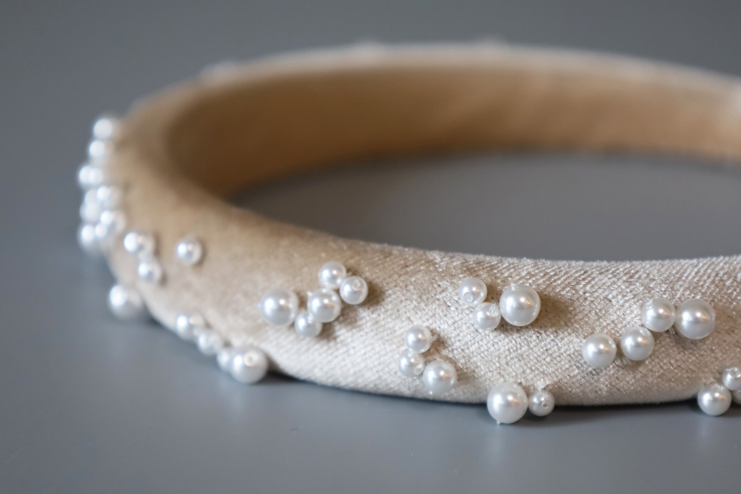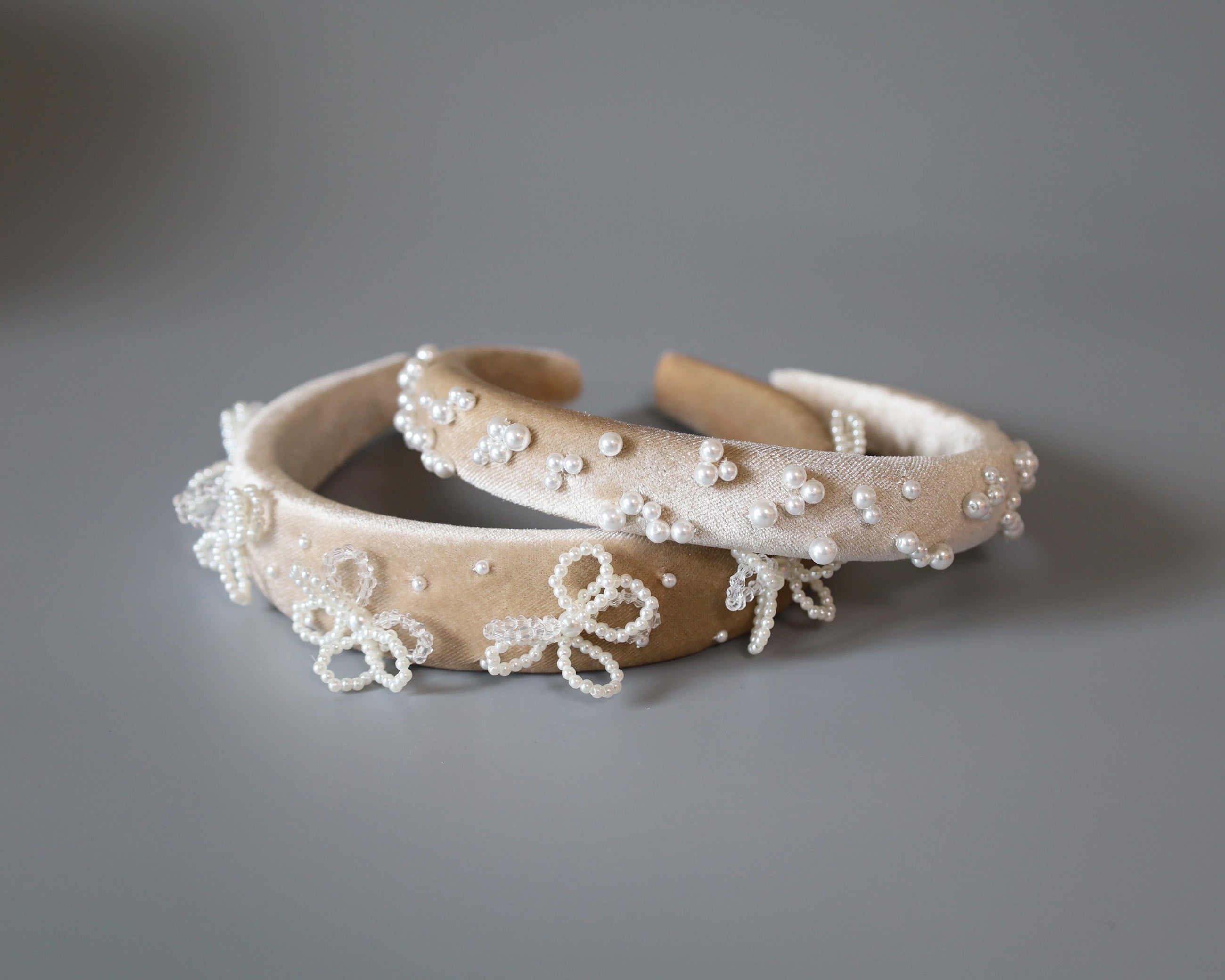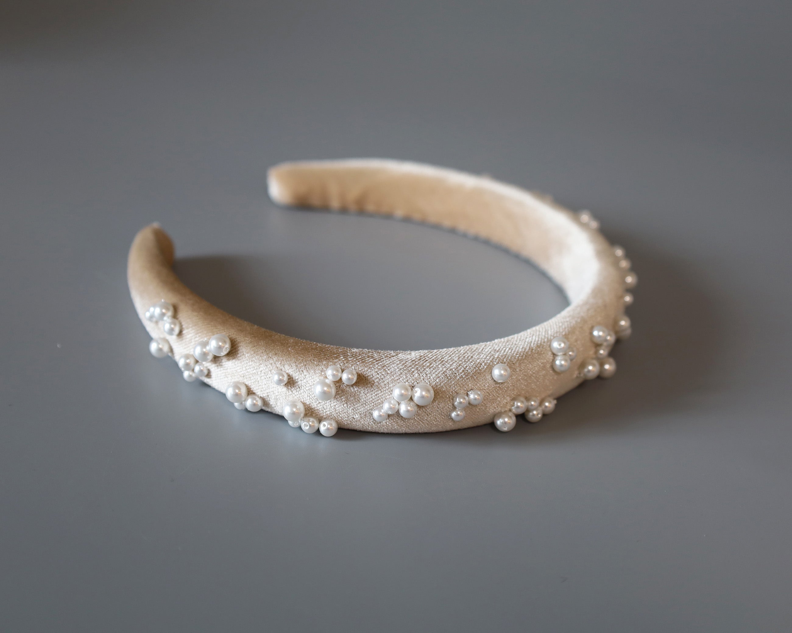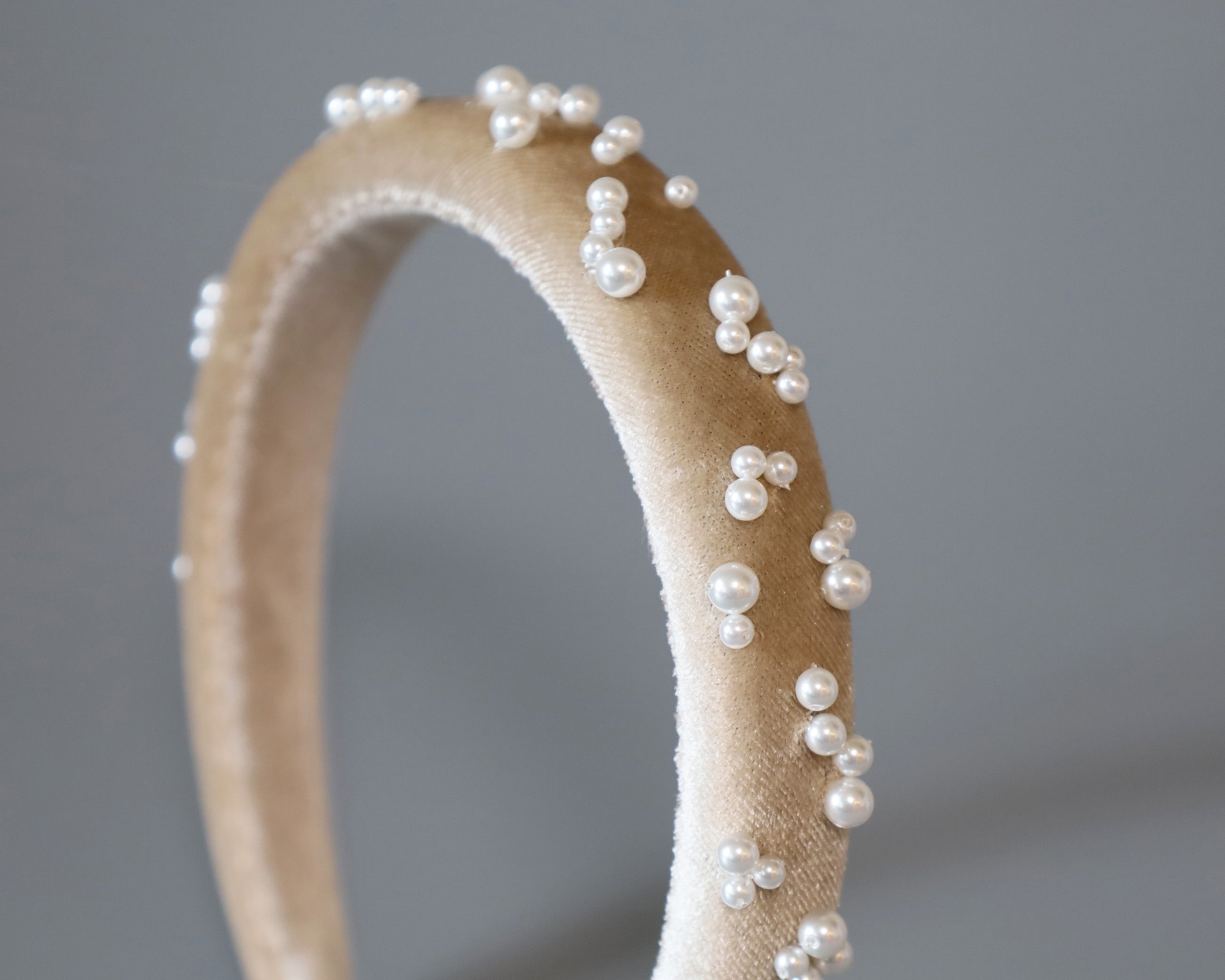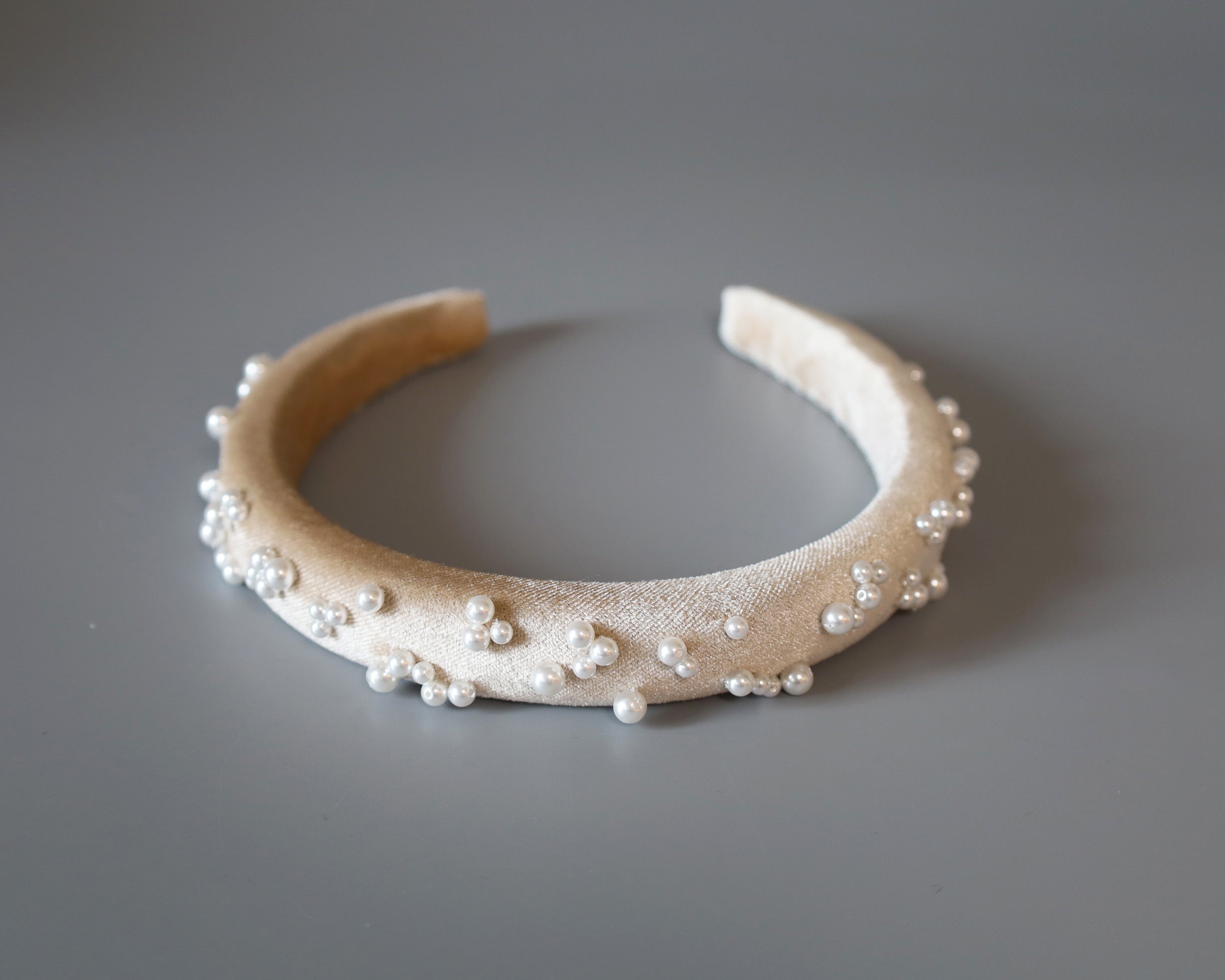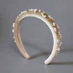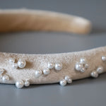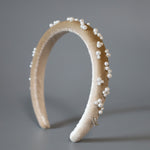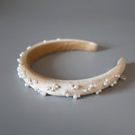 なめらかなベージュカラーのカチューシャに重ねるのは、上品な輝きのパール。