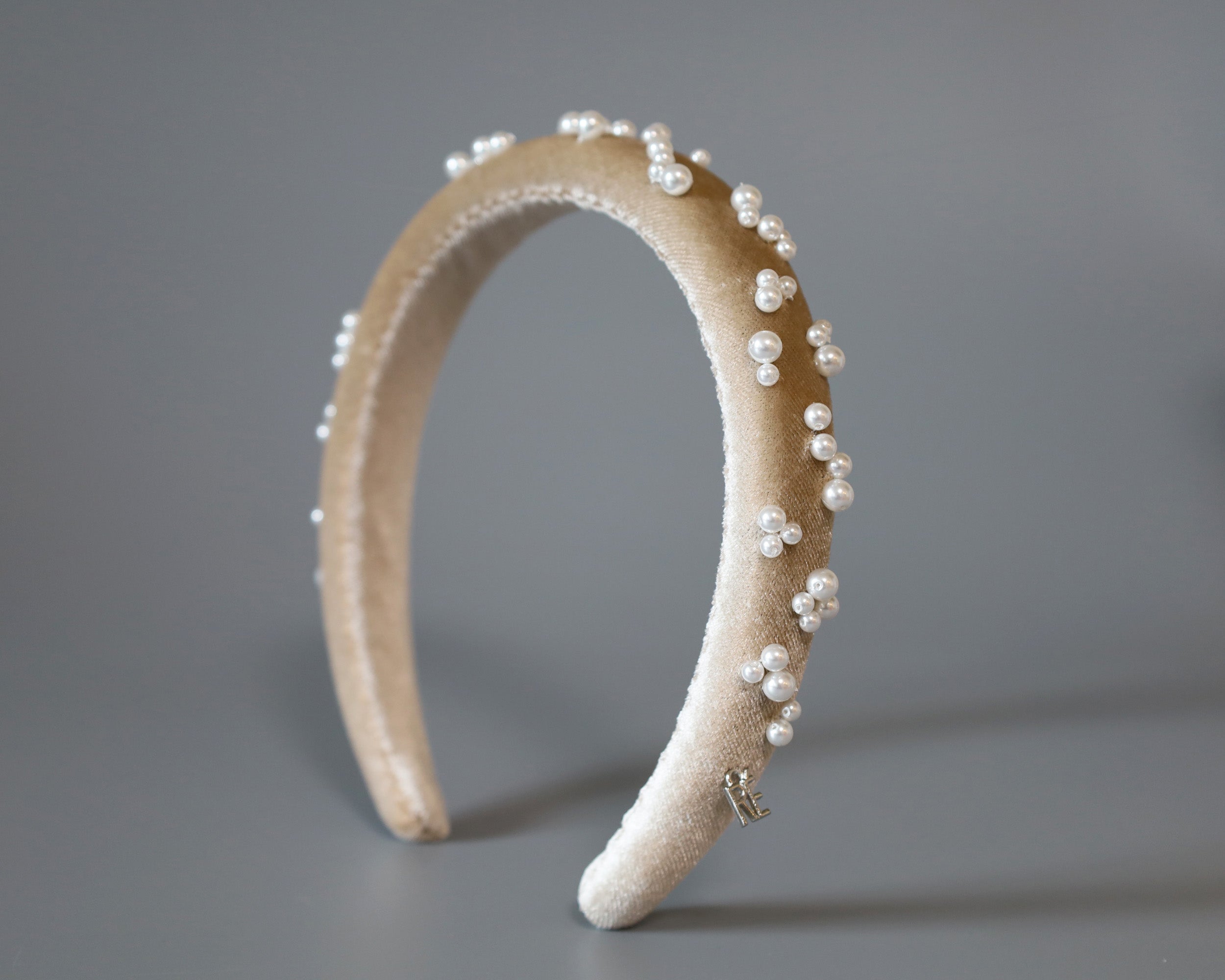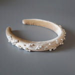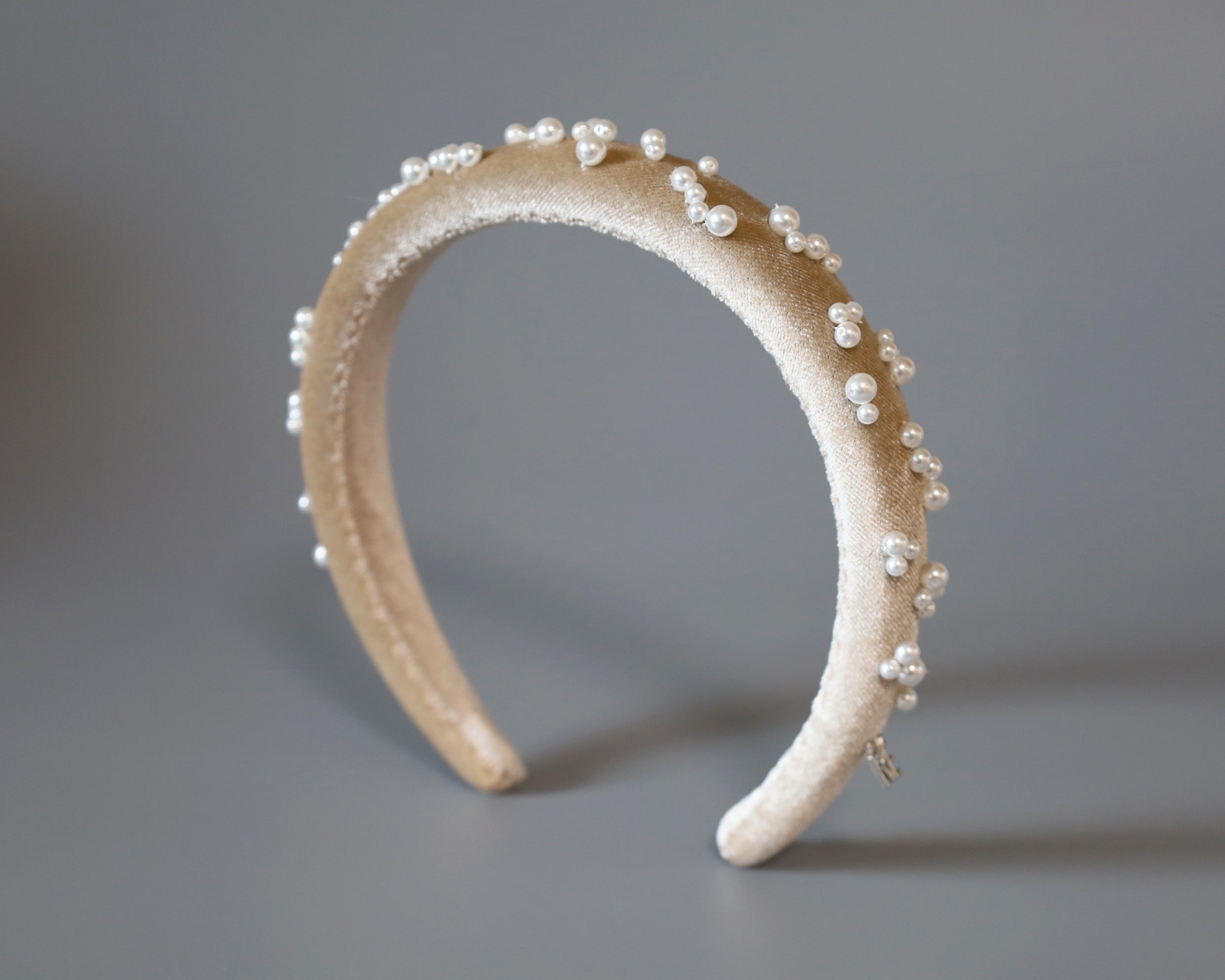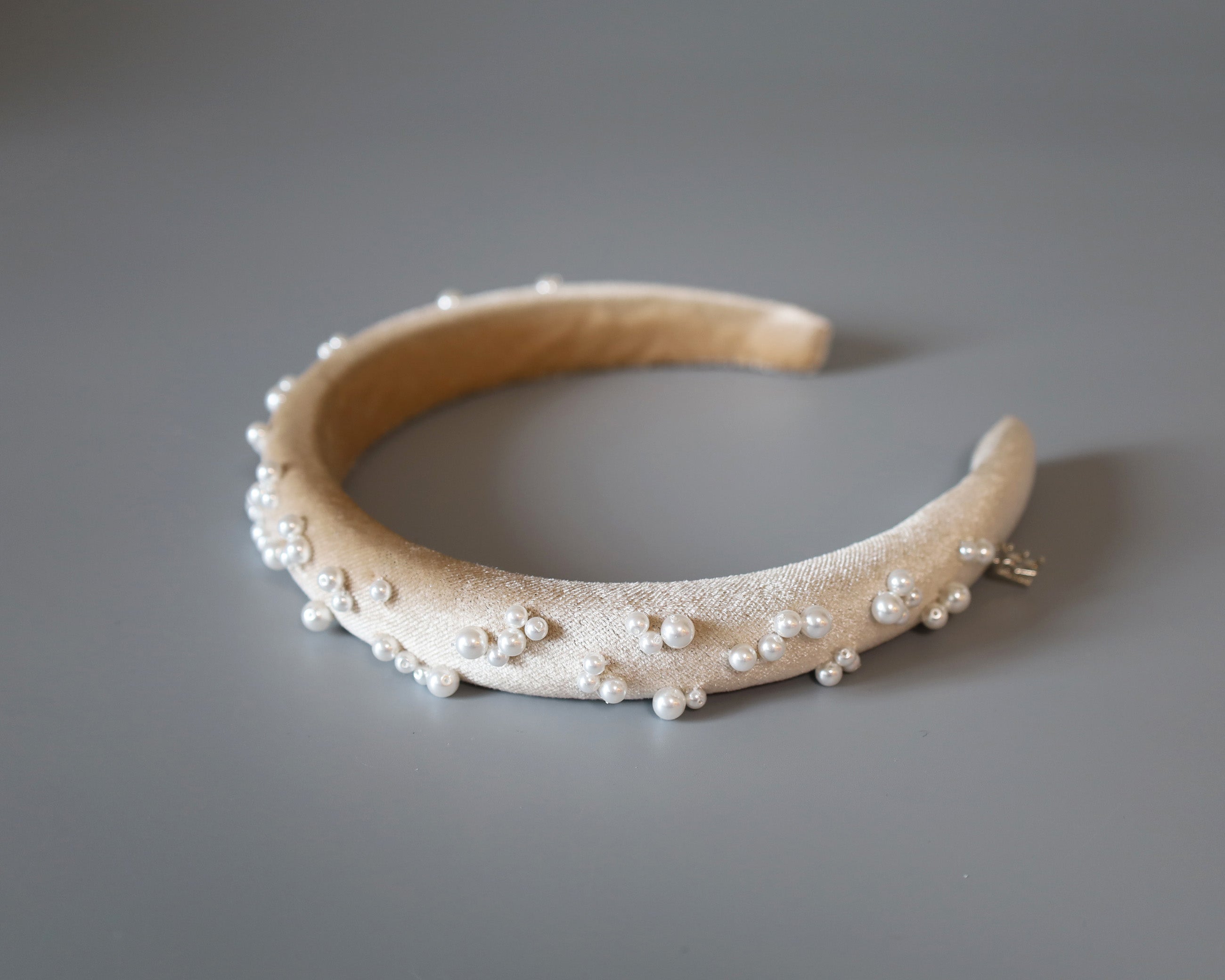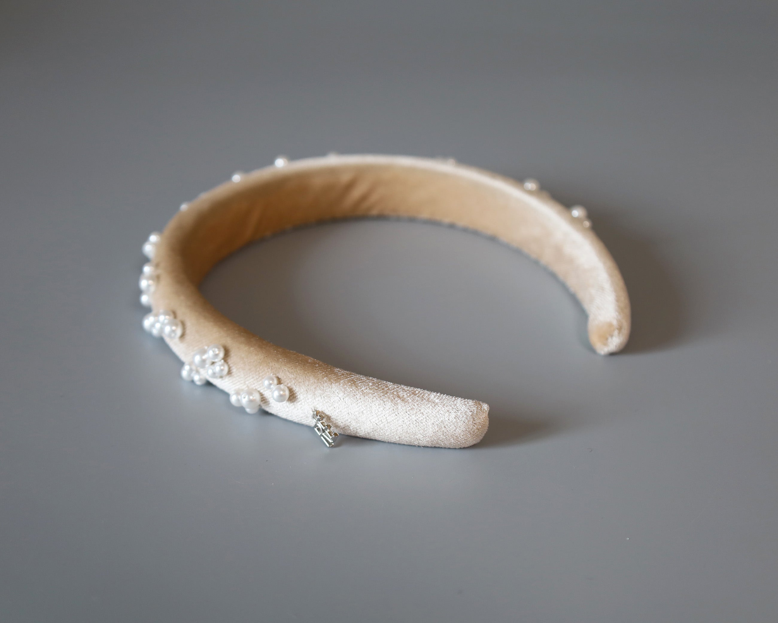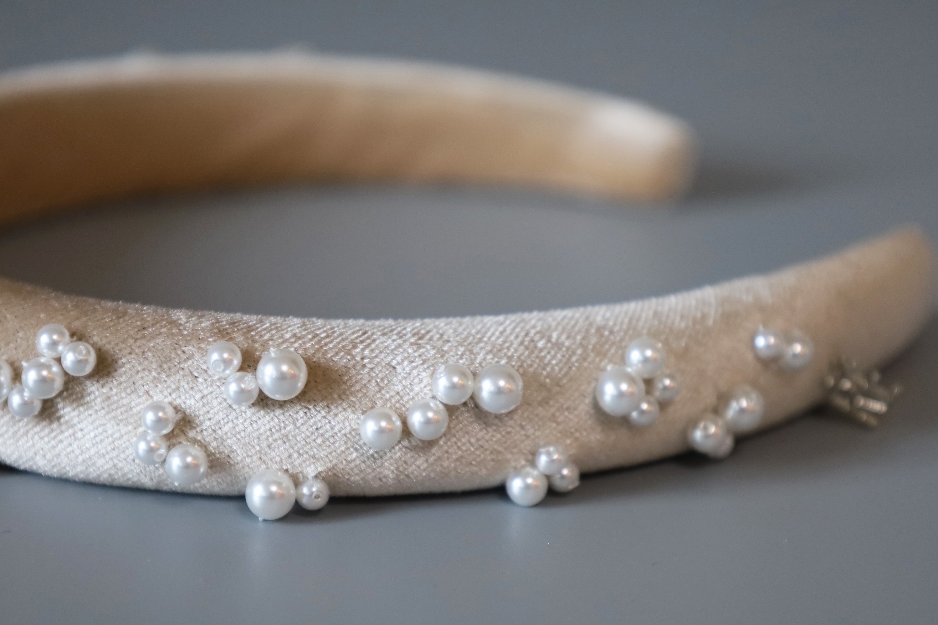なめらかなベージュカラーのカチューシャに重ねるのは、上品な輝きのパール。