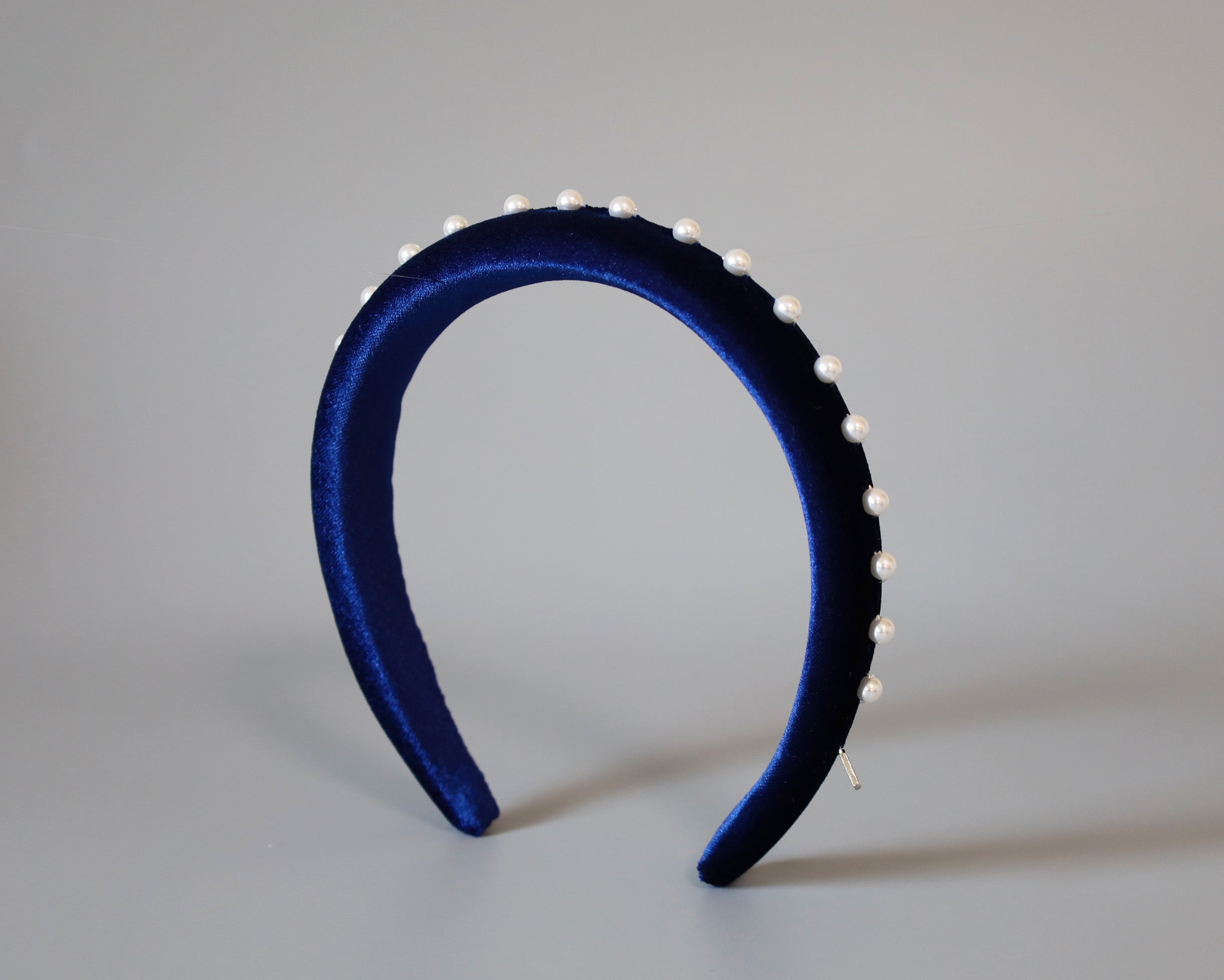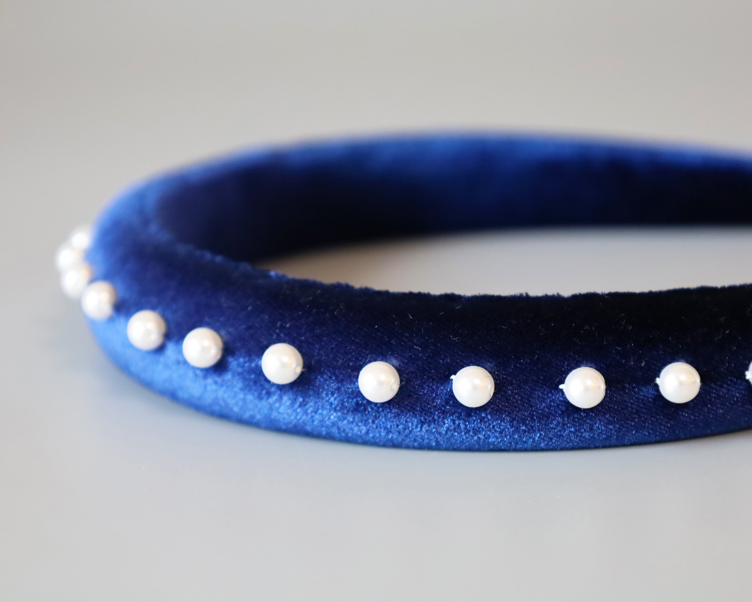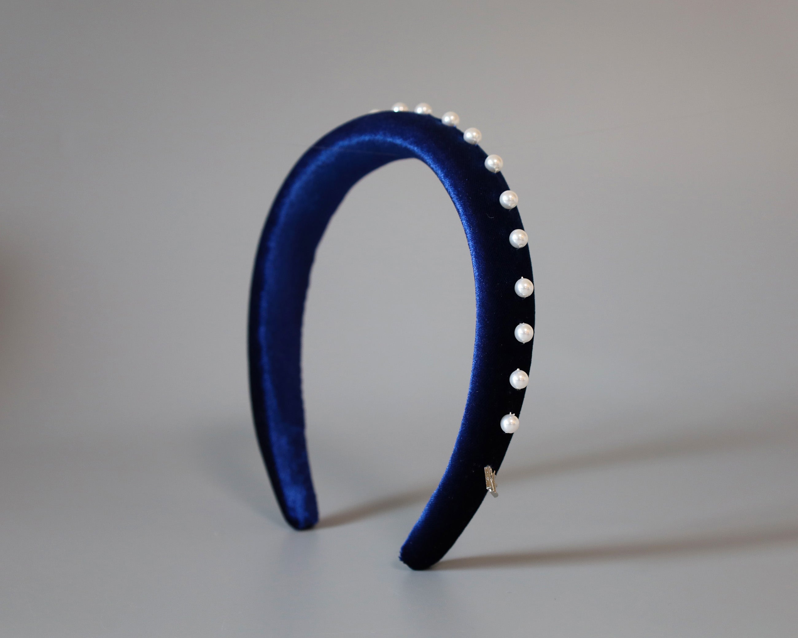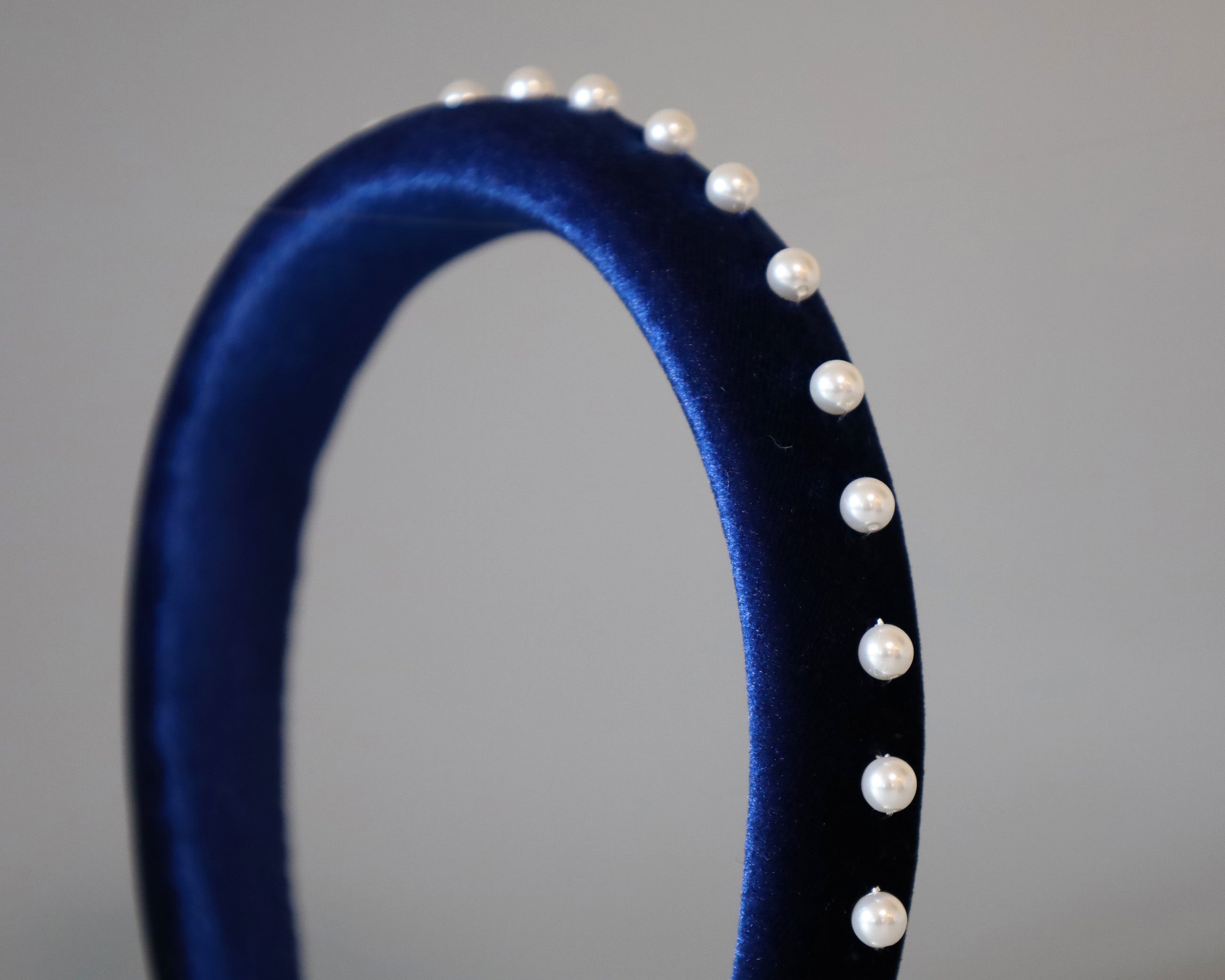 なめらかなネイビーのベロア生地にパールビーズを1列に並べたエレガントなカチューシャ。
