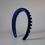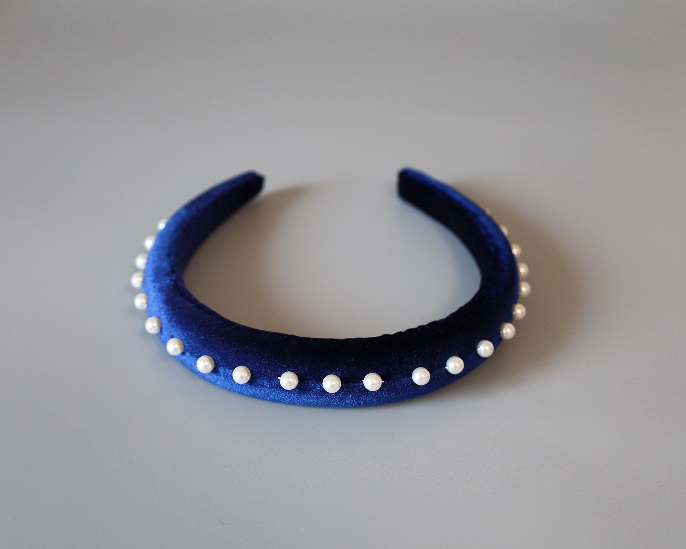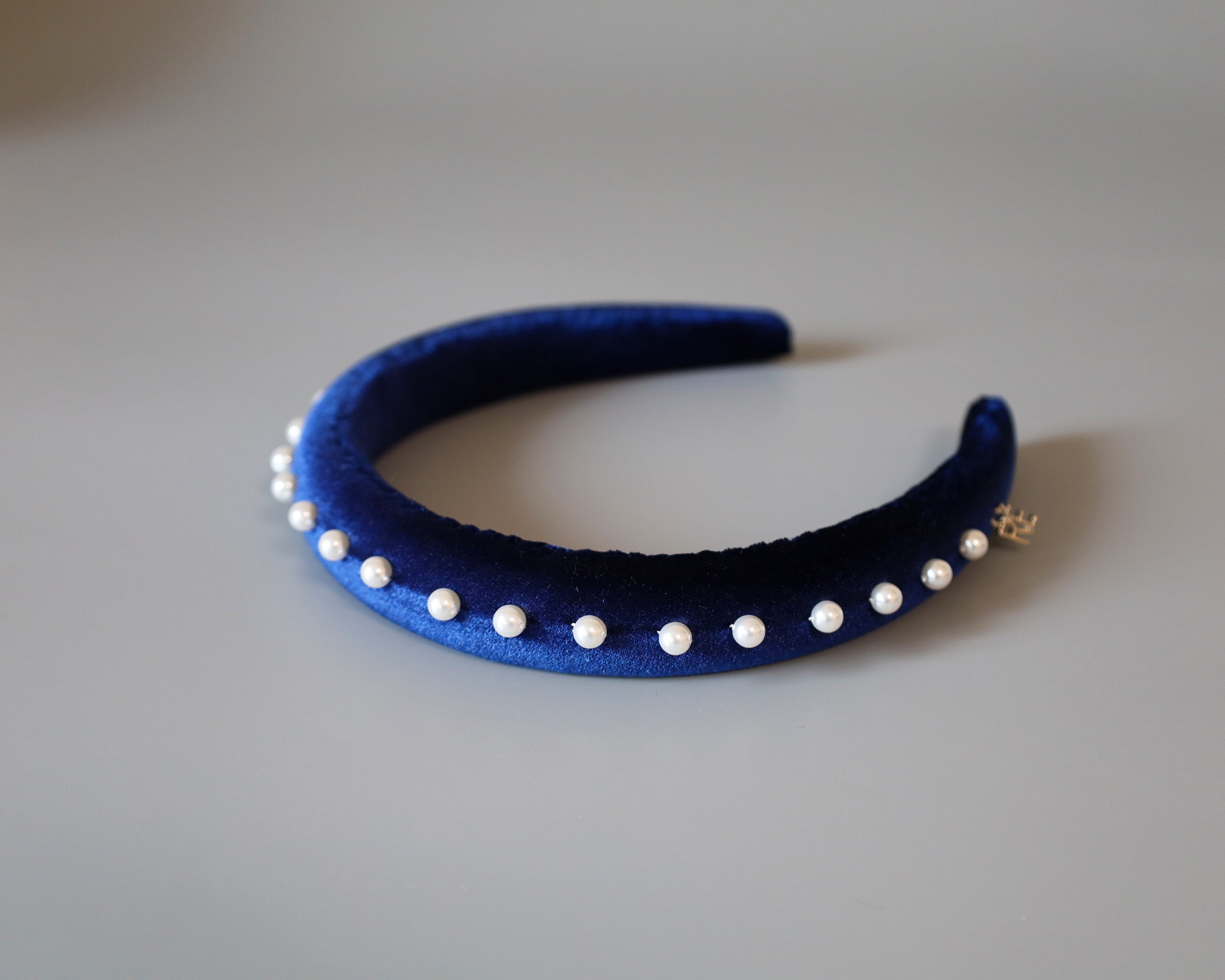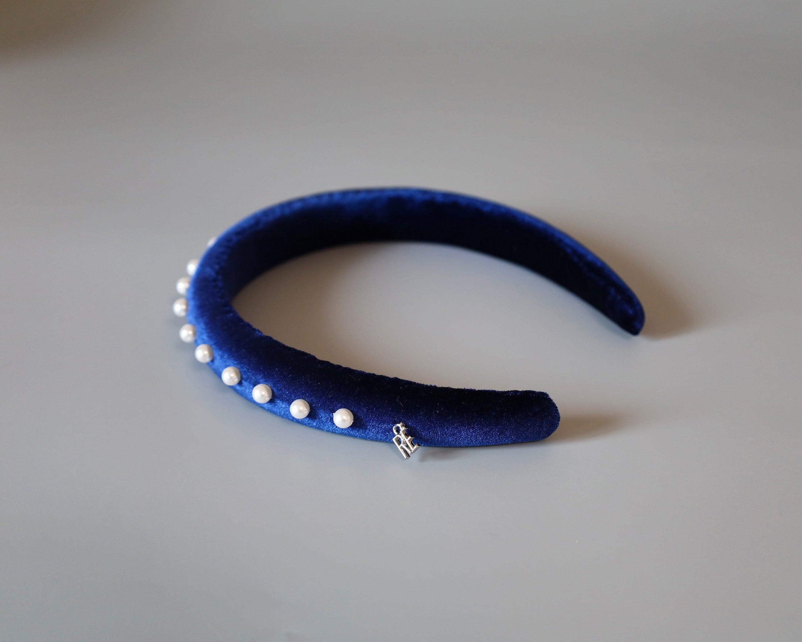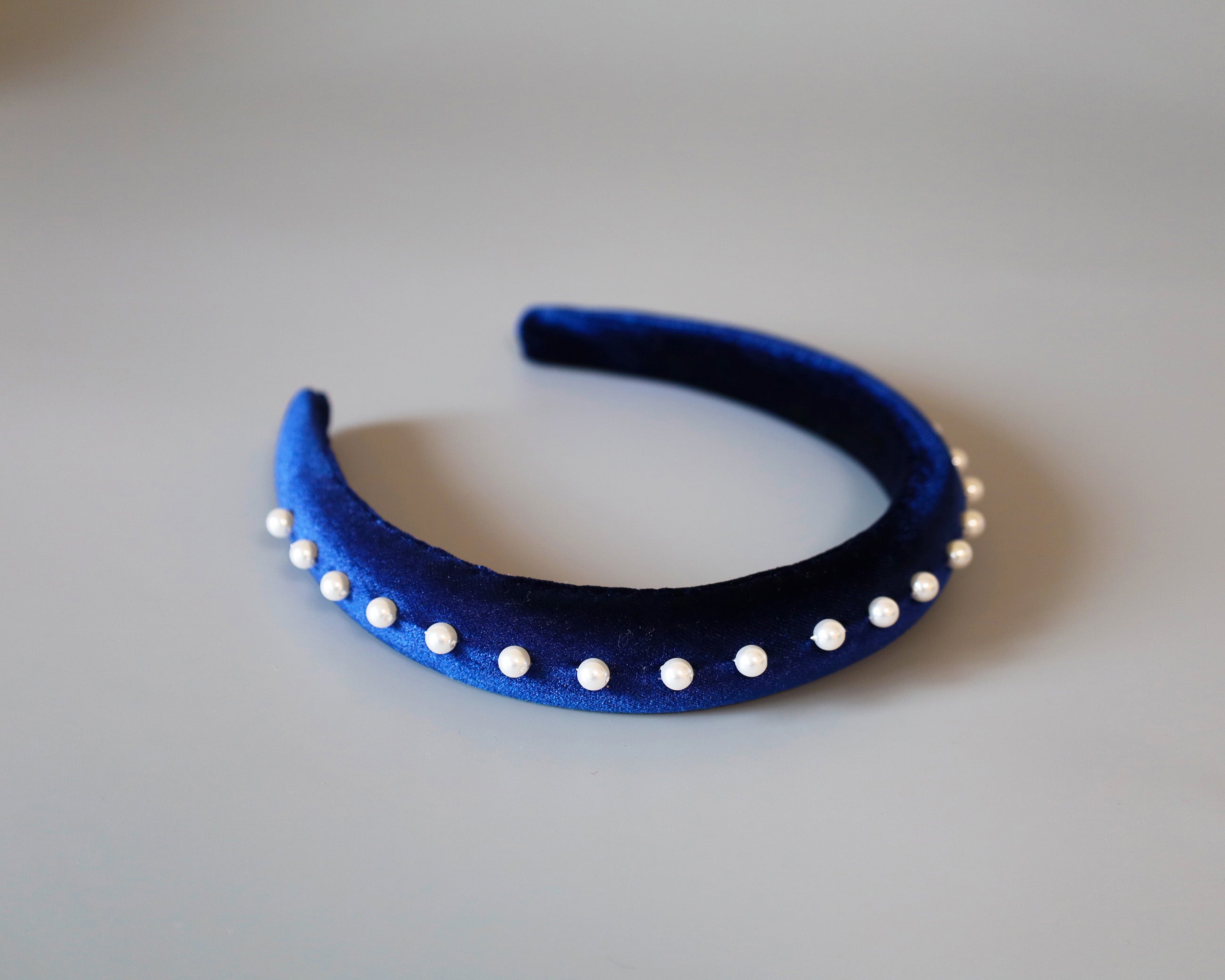 なめらかなネイビーのベロア生地にパールビーズを1列に並べたエレガントなカチューシャ。