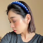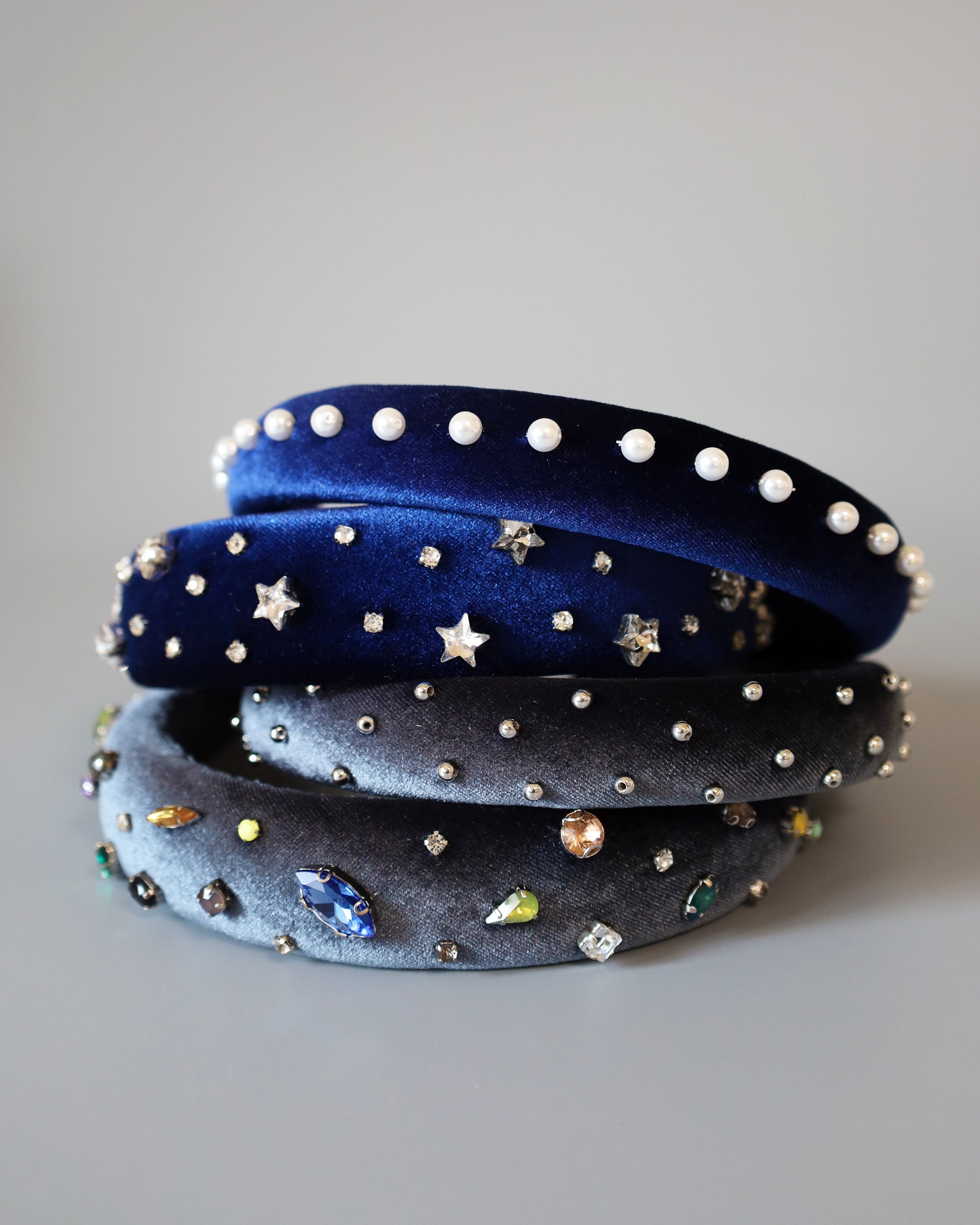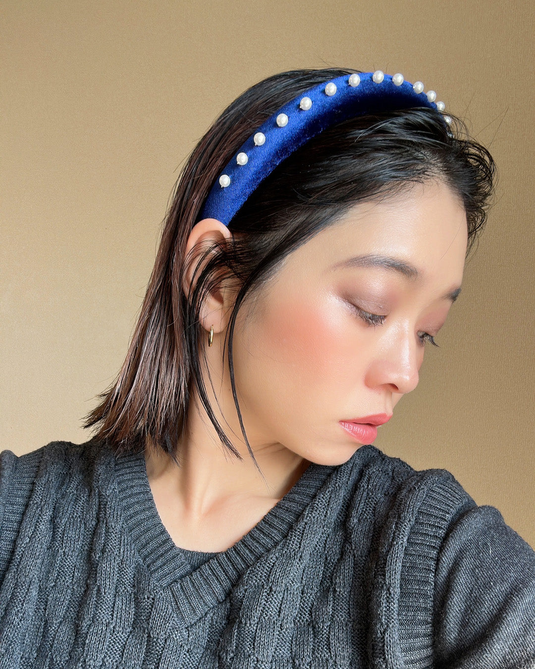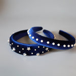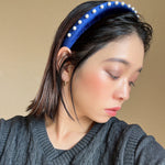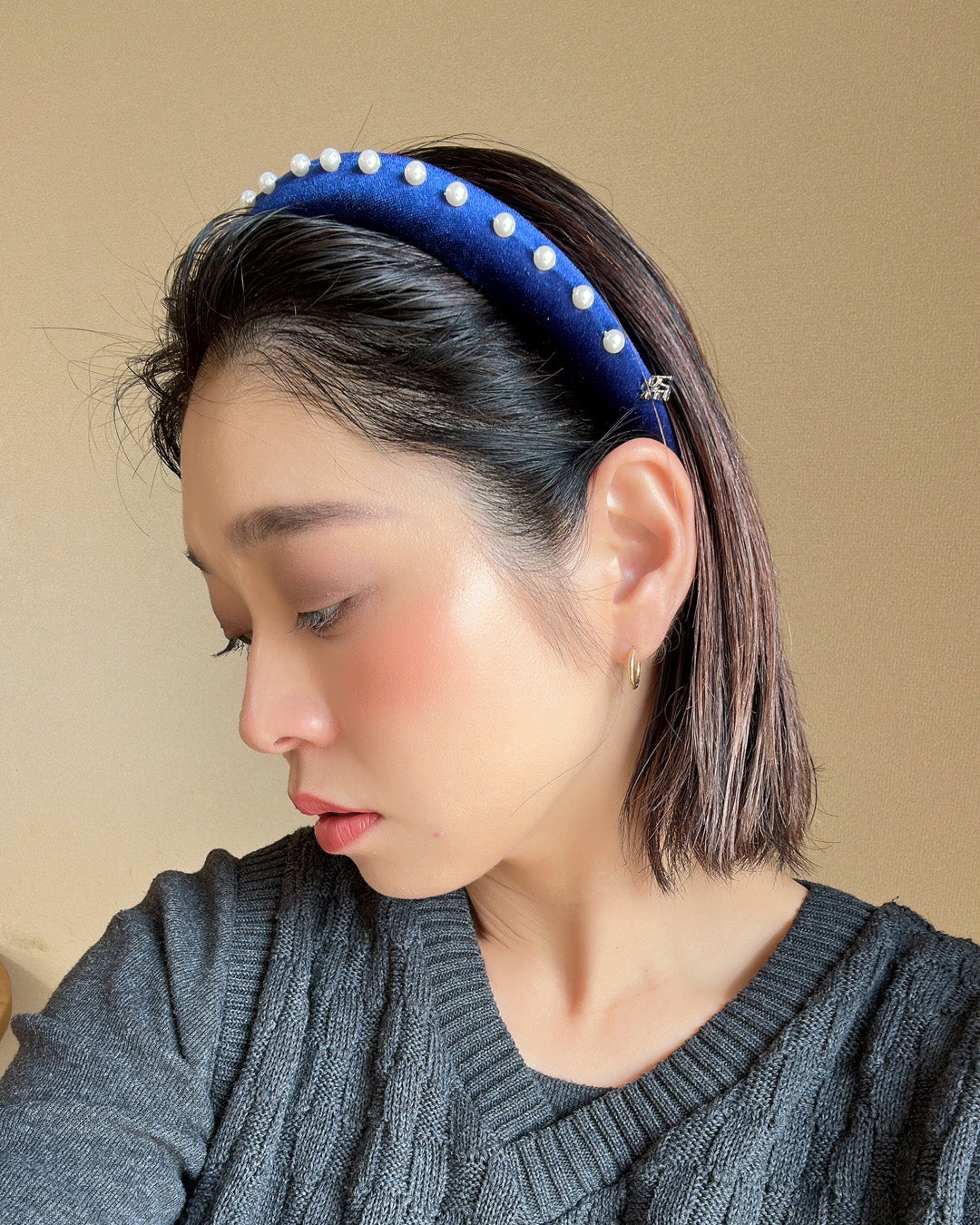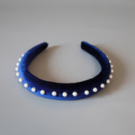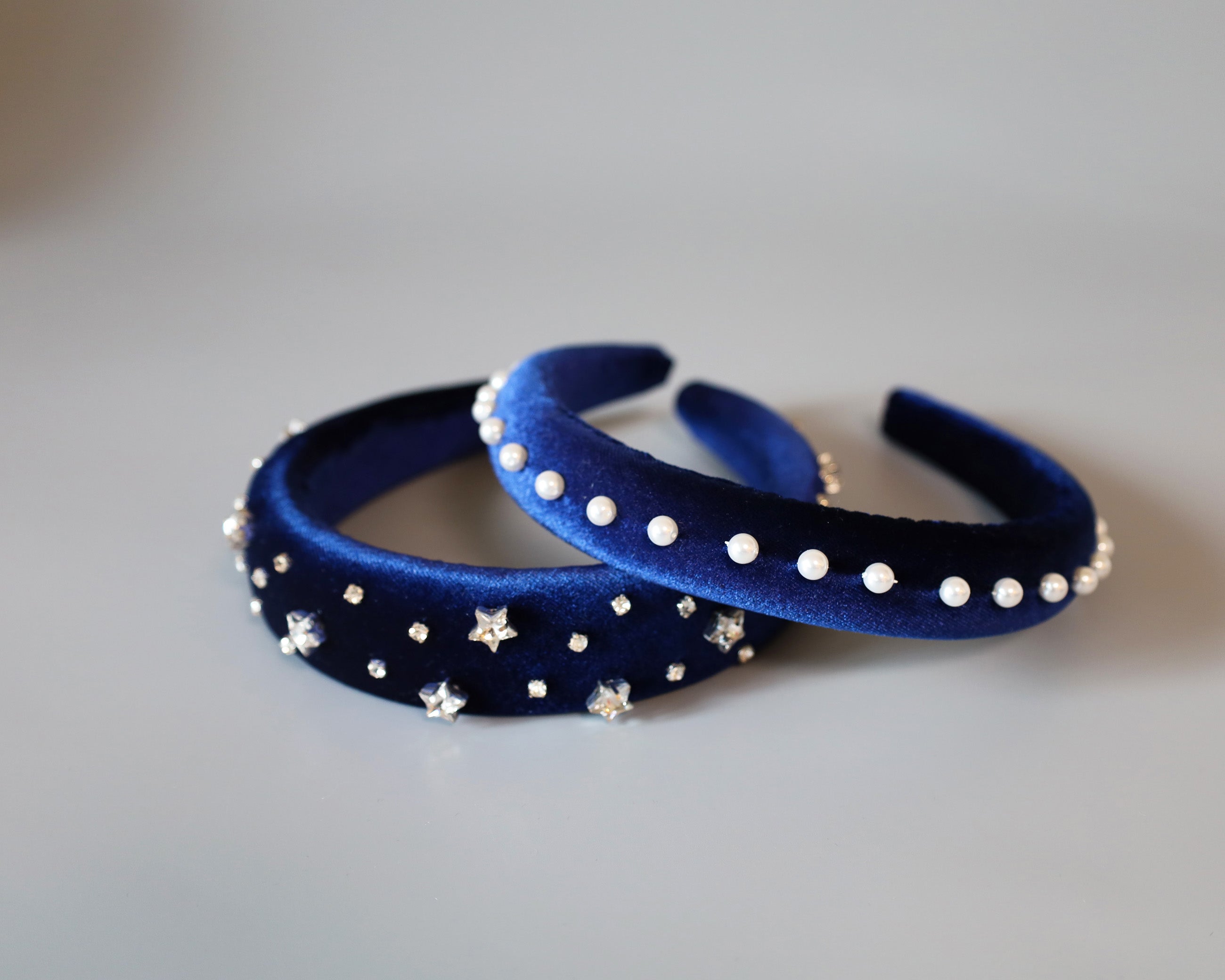 なめらかなネイビーのベロア生地にパールビーズを1列に並べたエレガントなカチューシャ。
