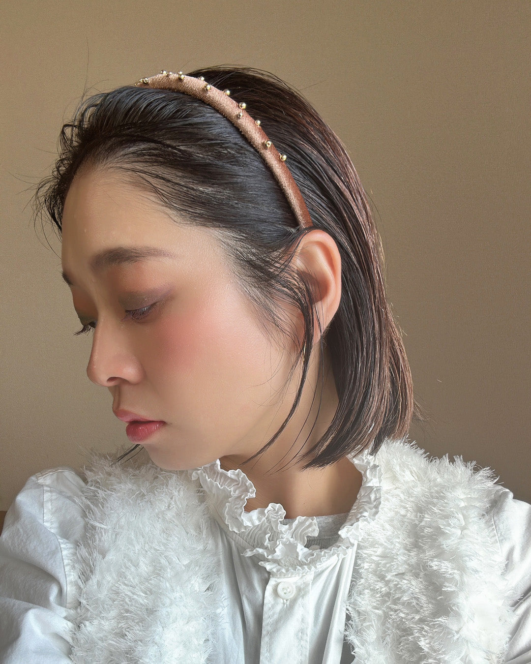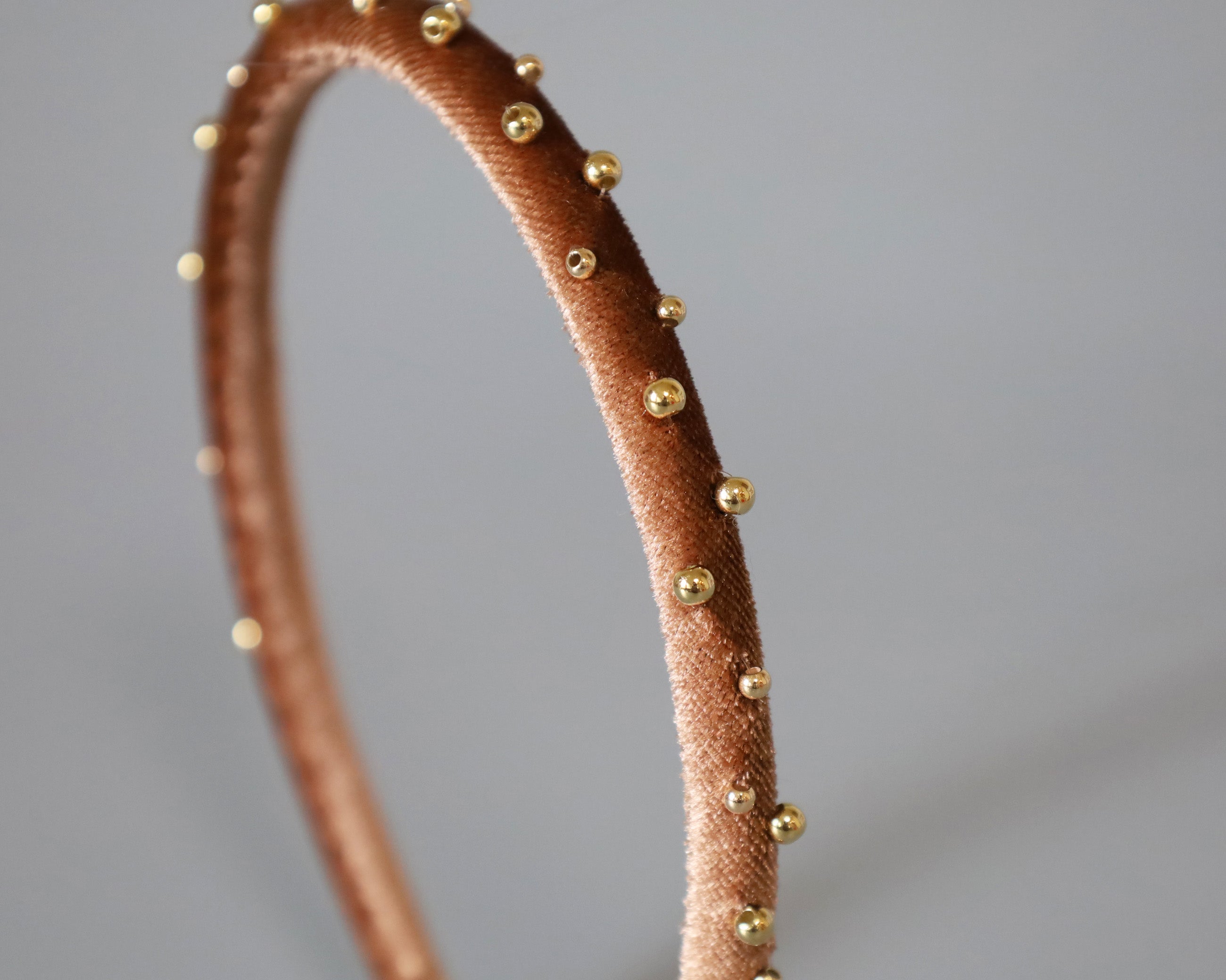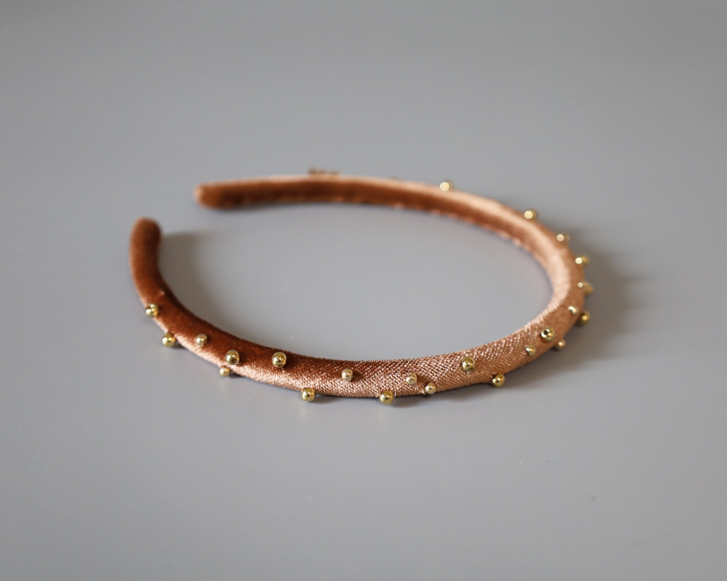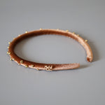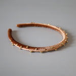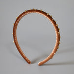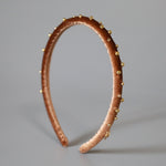 軽やかなブラウンカラーにゴールドのビーズを散りばめたカチューシャ。