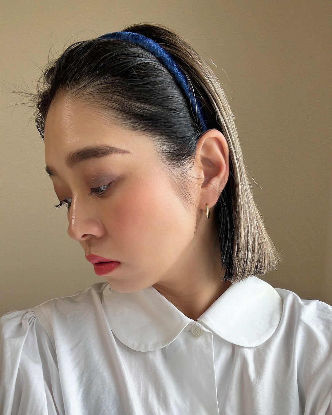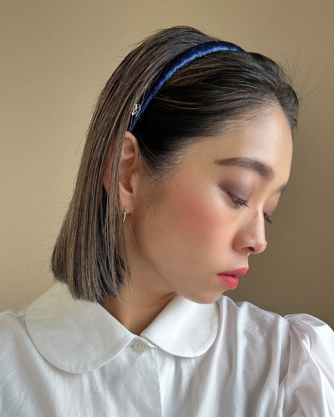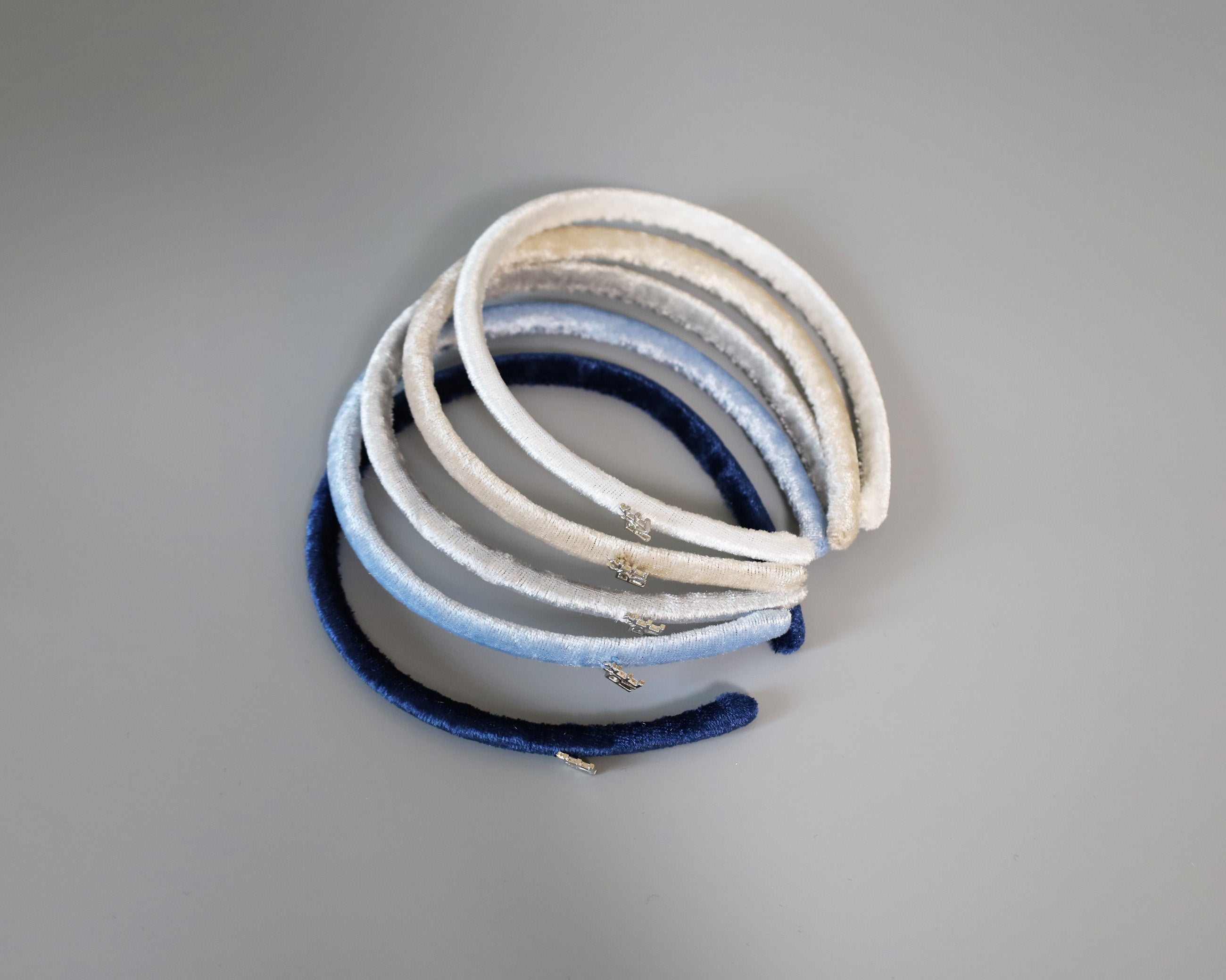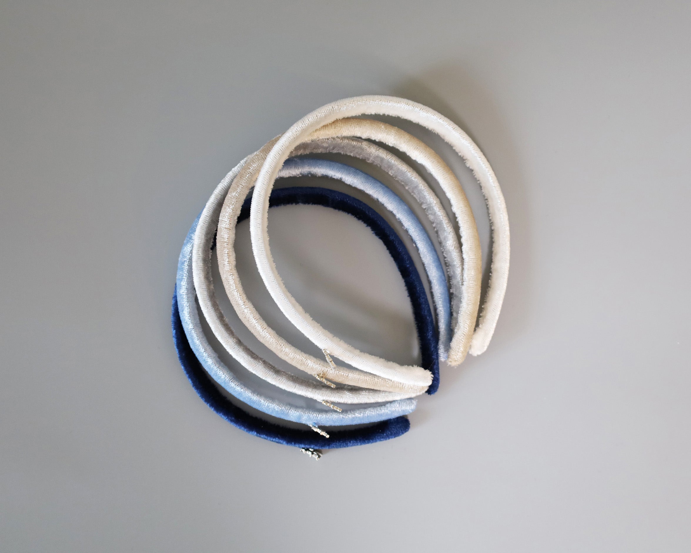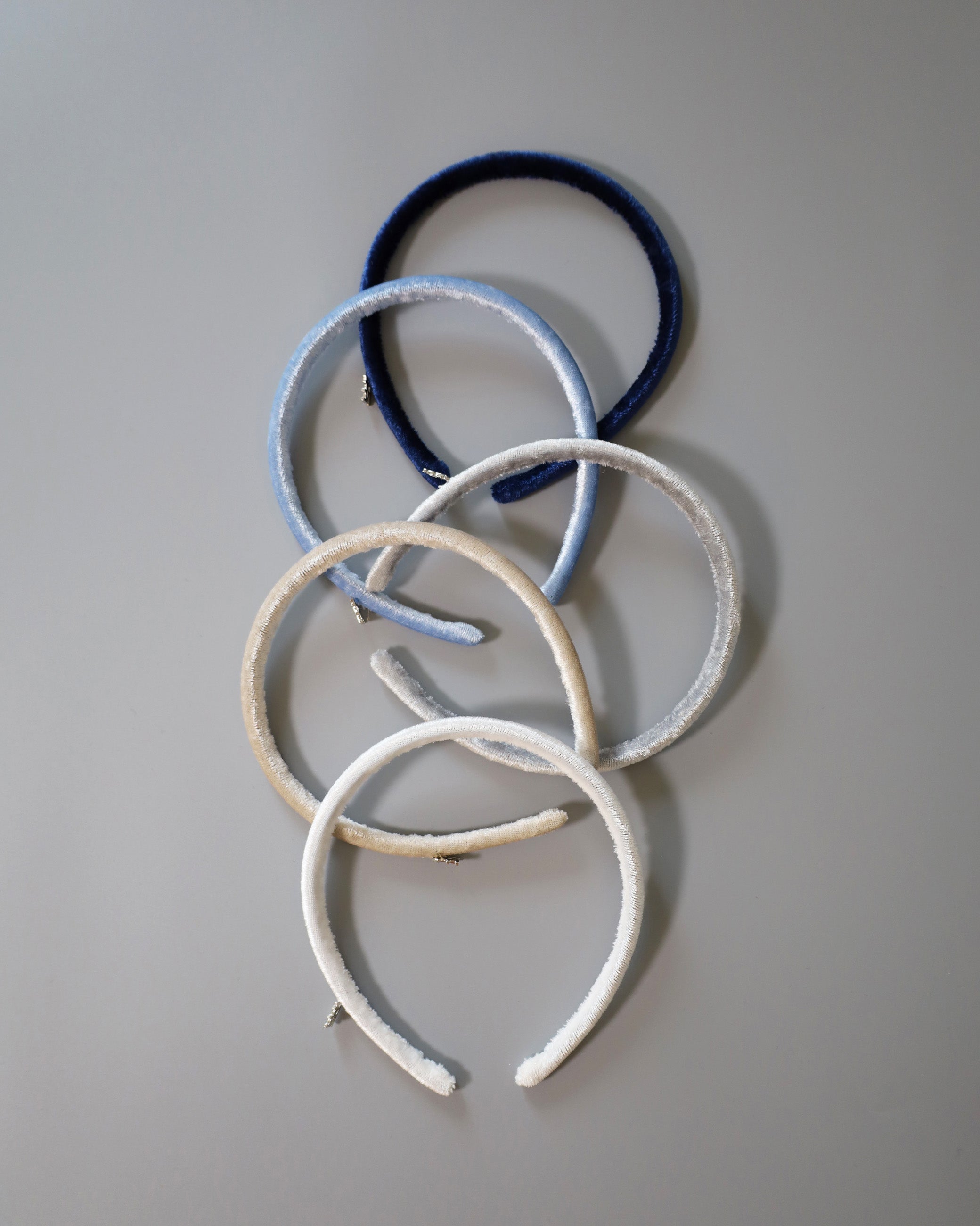 光沢感がリッチなネイビーのベロアカチューシャ。