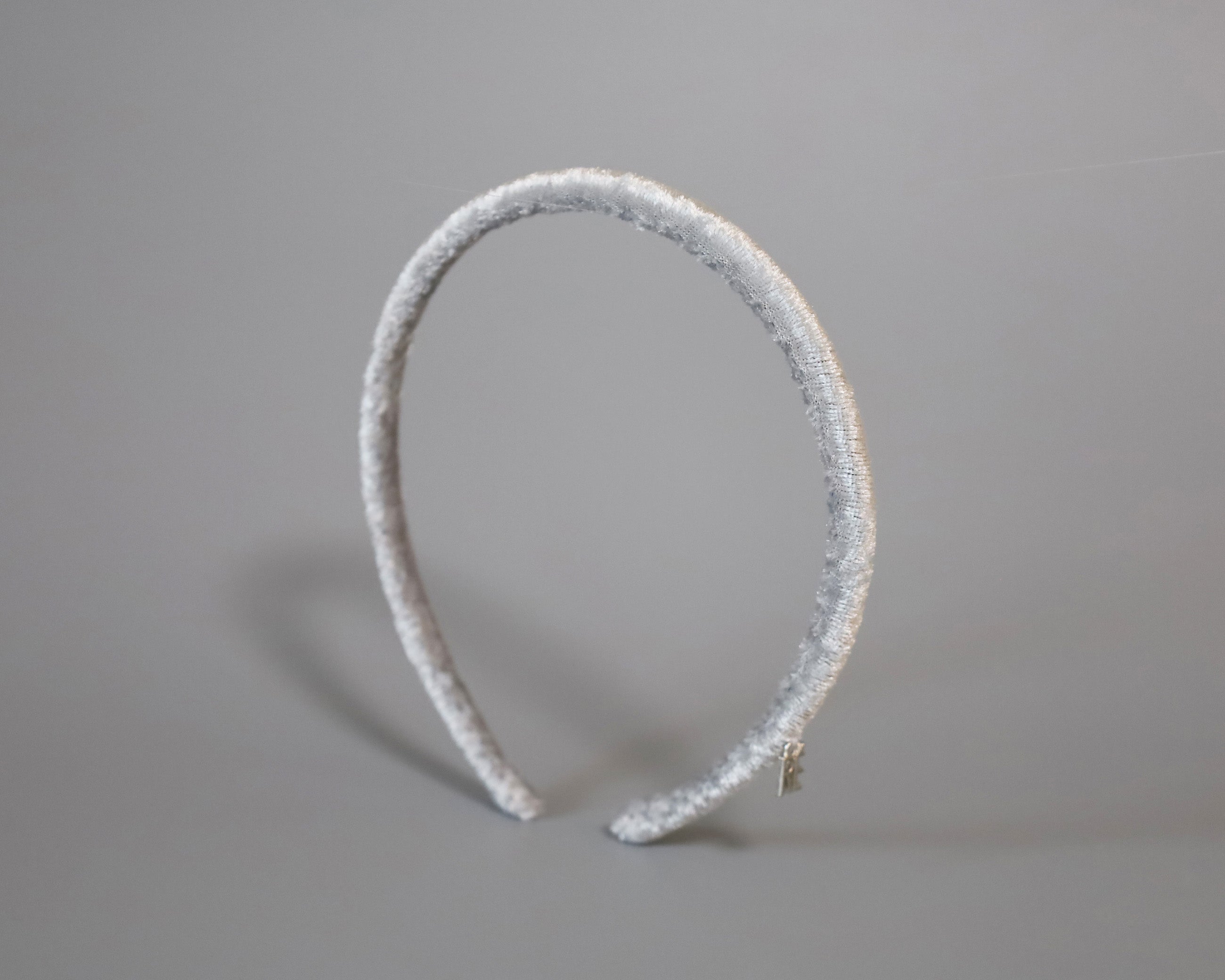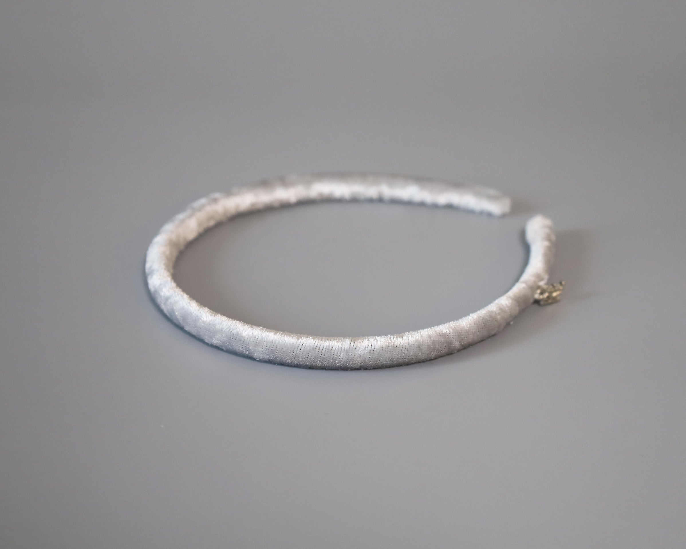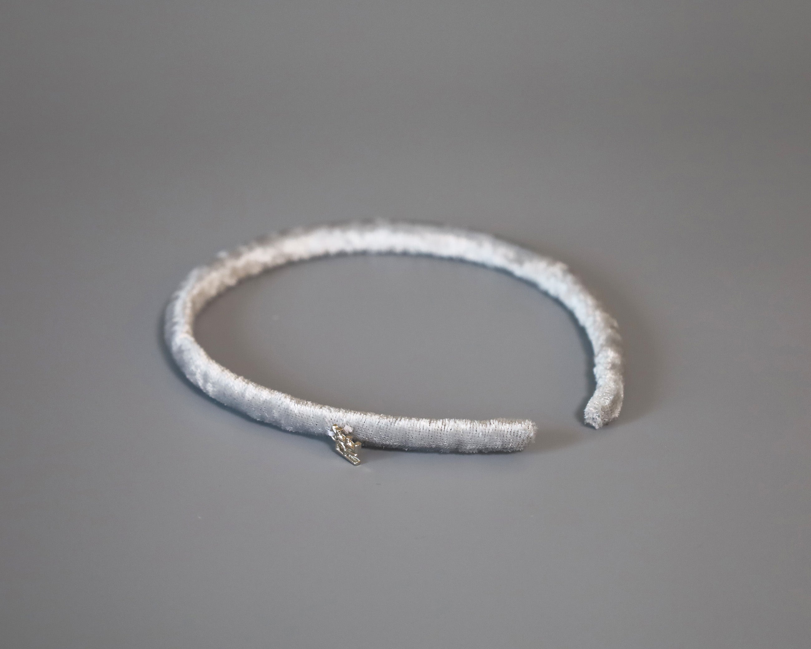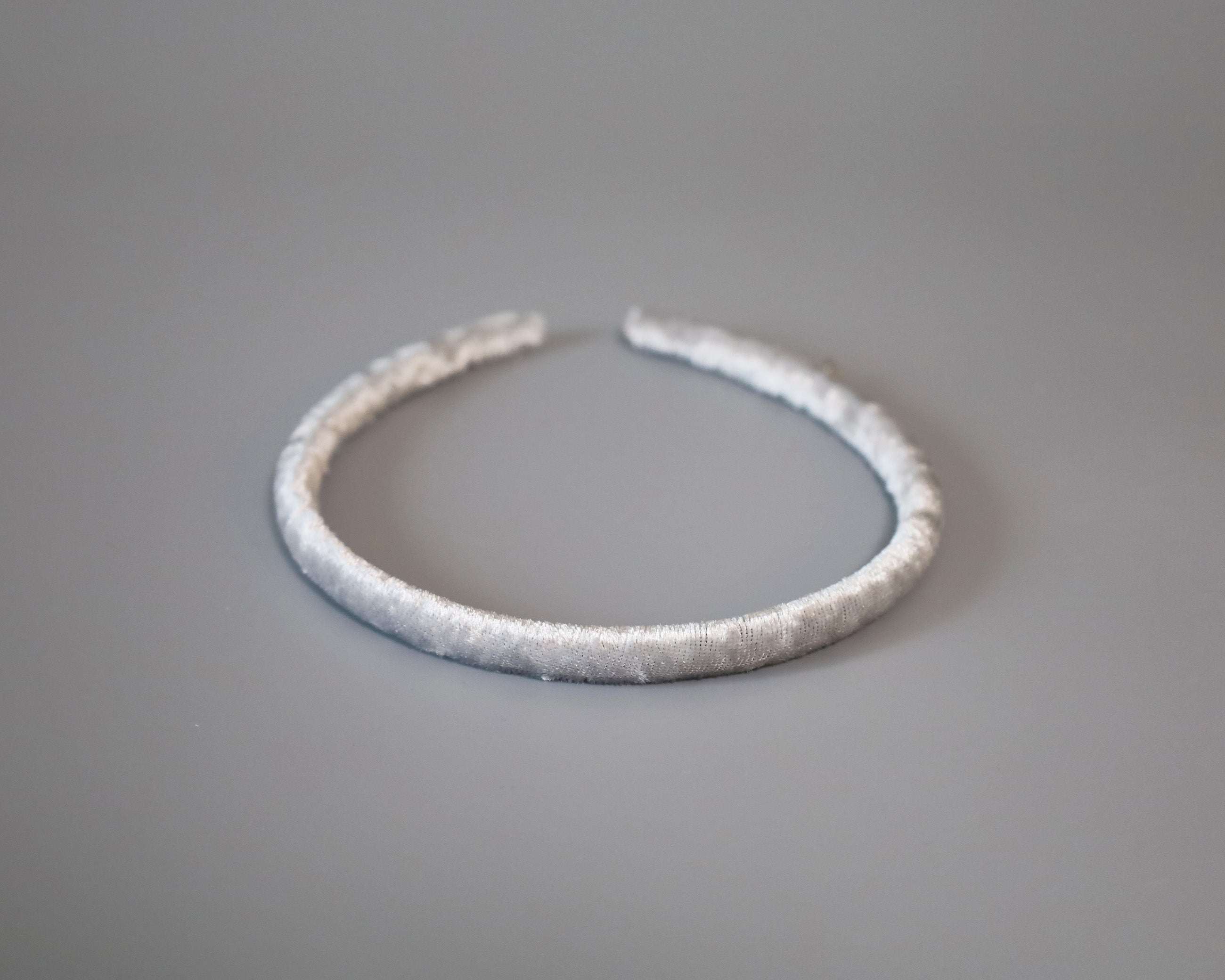 明るいシルバーカラーがフューチャリスティックな細身のベロアカチューシャ。