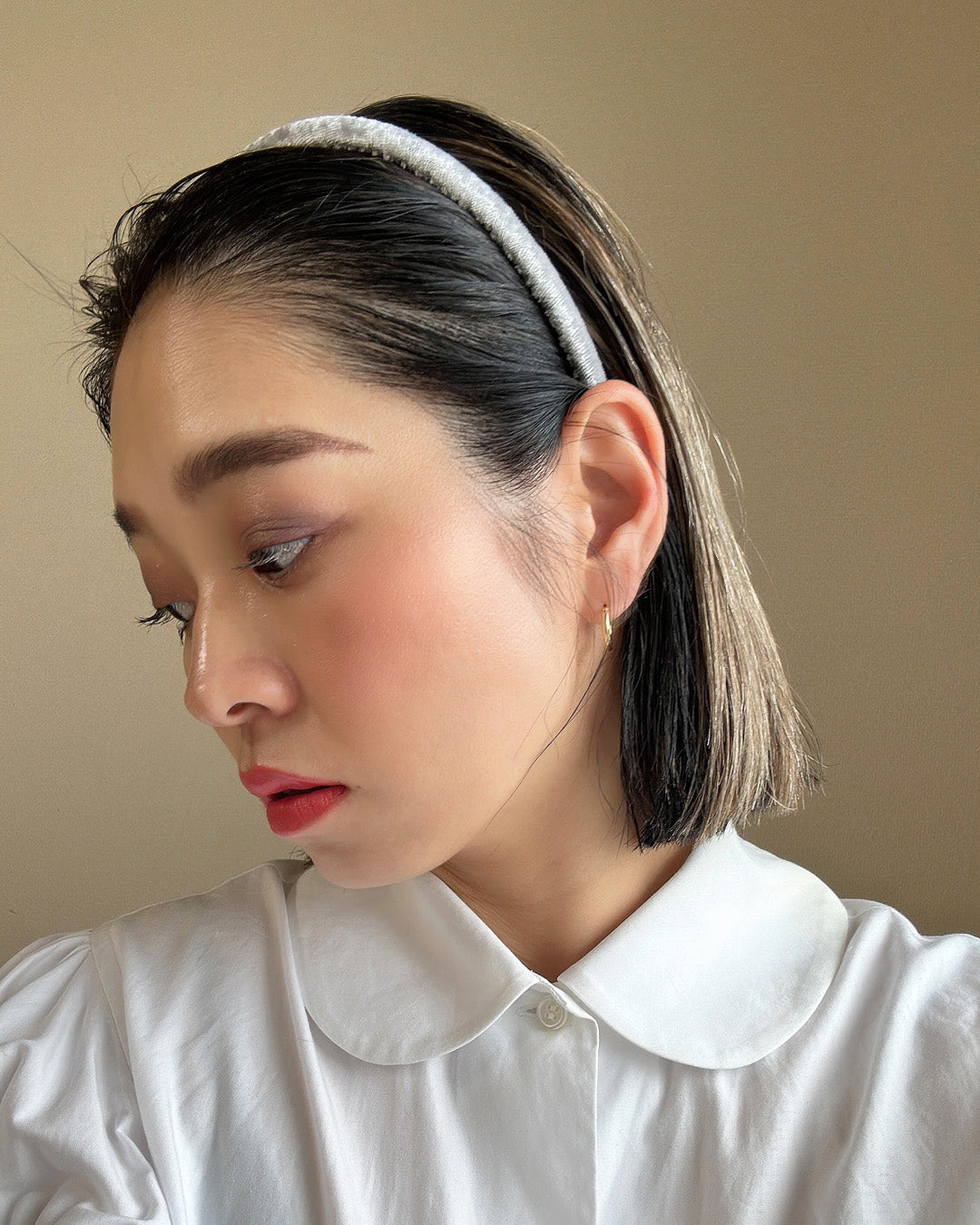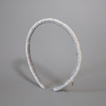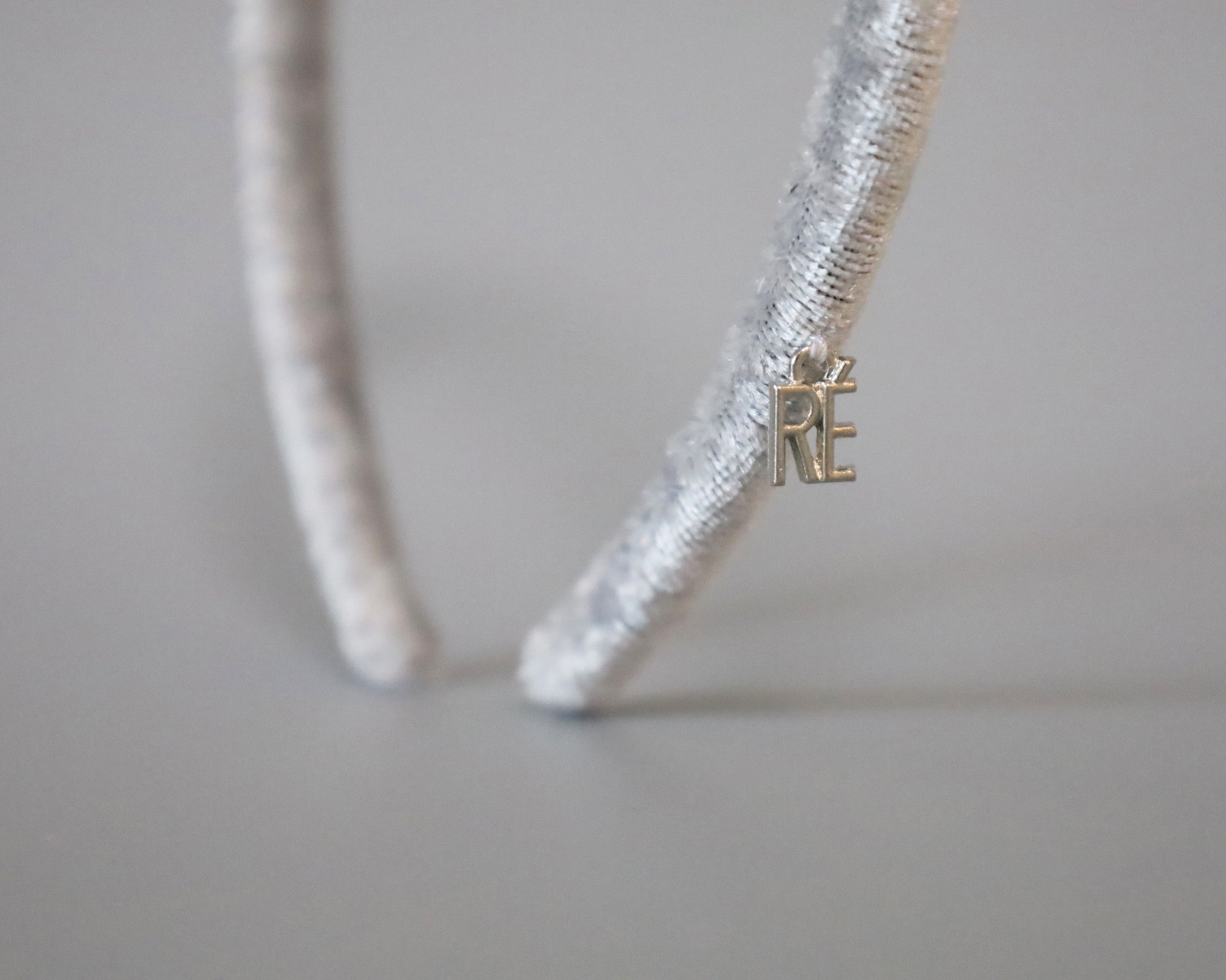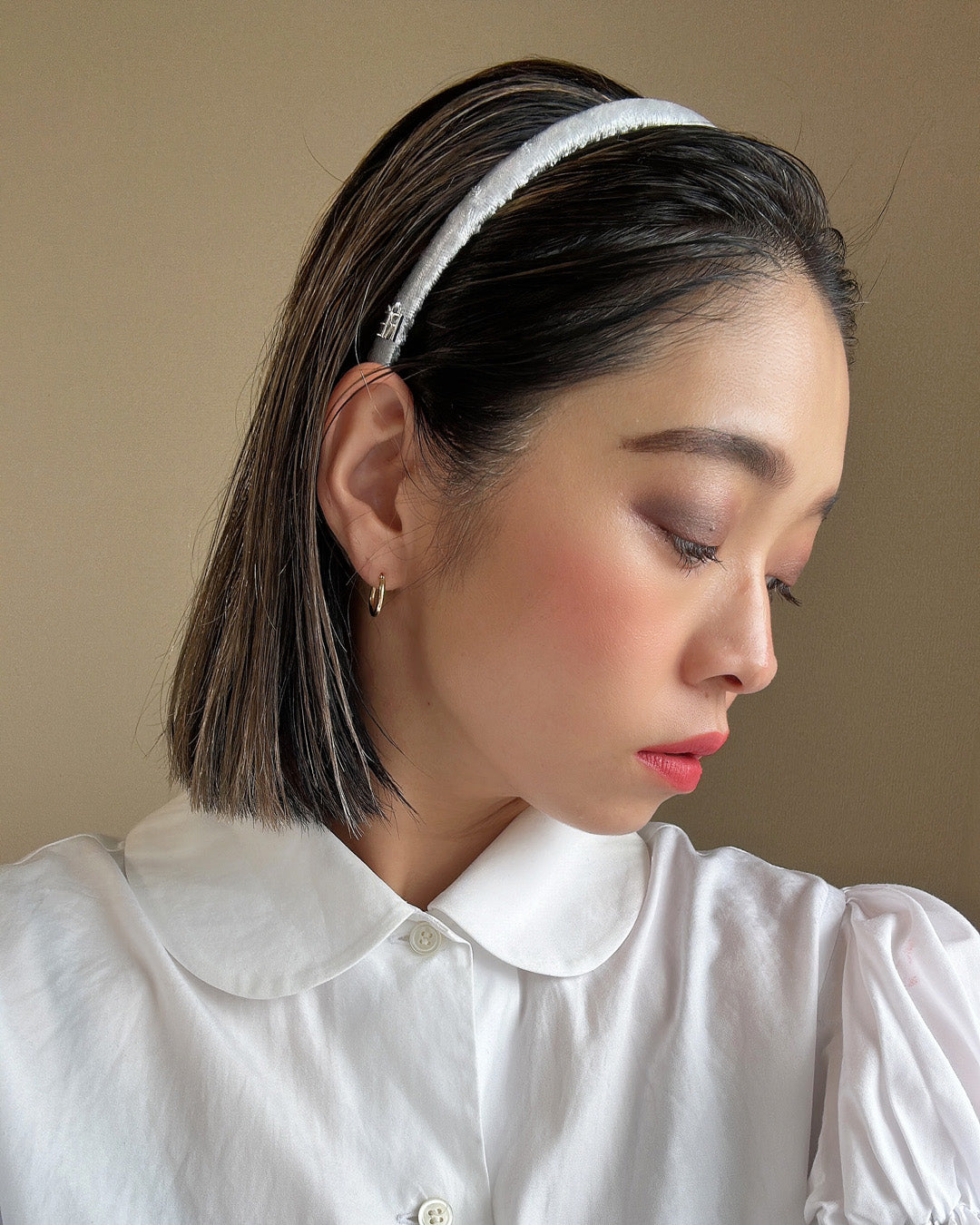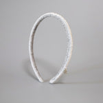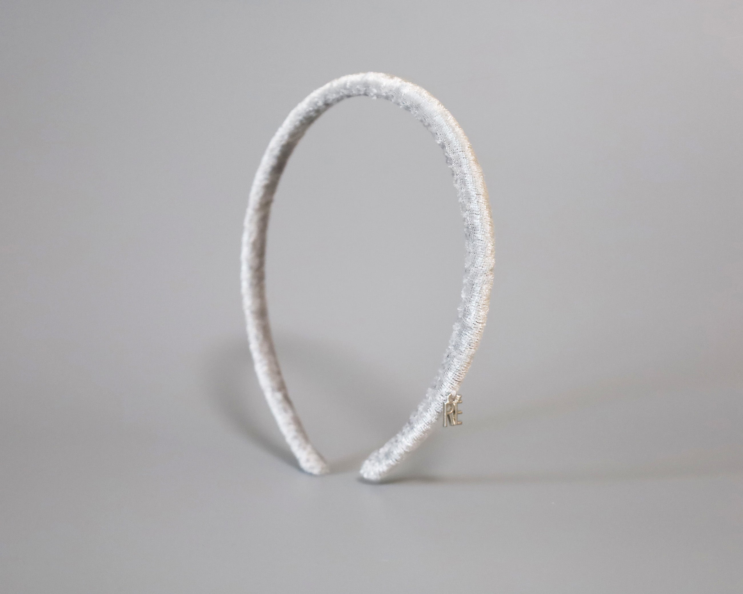 明るいシルバーカラーがフューチャリスティックな細身のベロアカチューシャ。