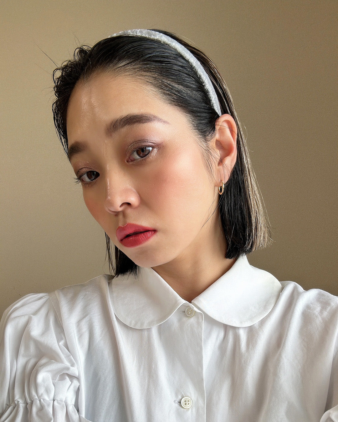おくれ毛を残しつつ毛先を遊ばせたカチモリアレンジに合わせればトレンド感たっぷりなスタイリングに。