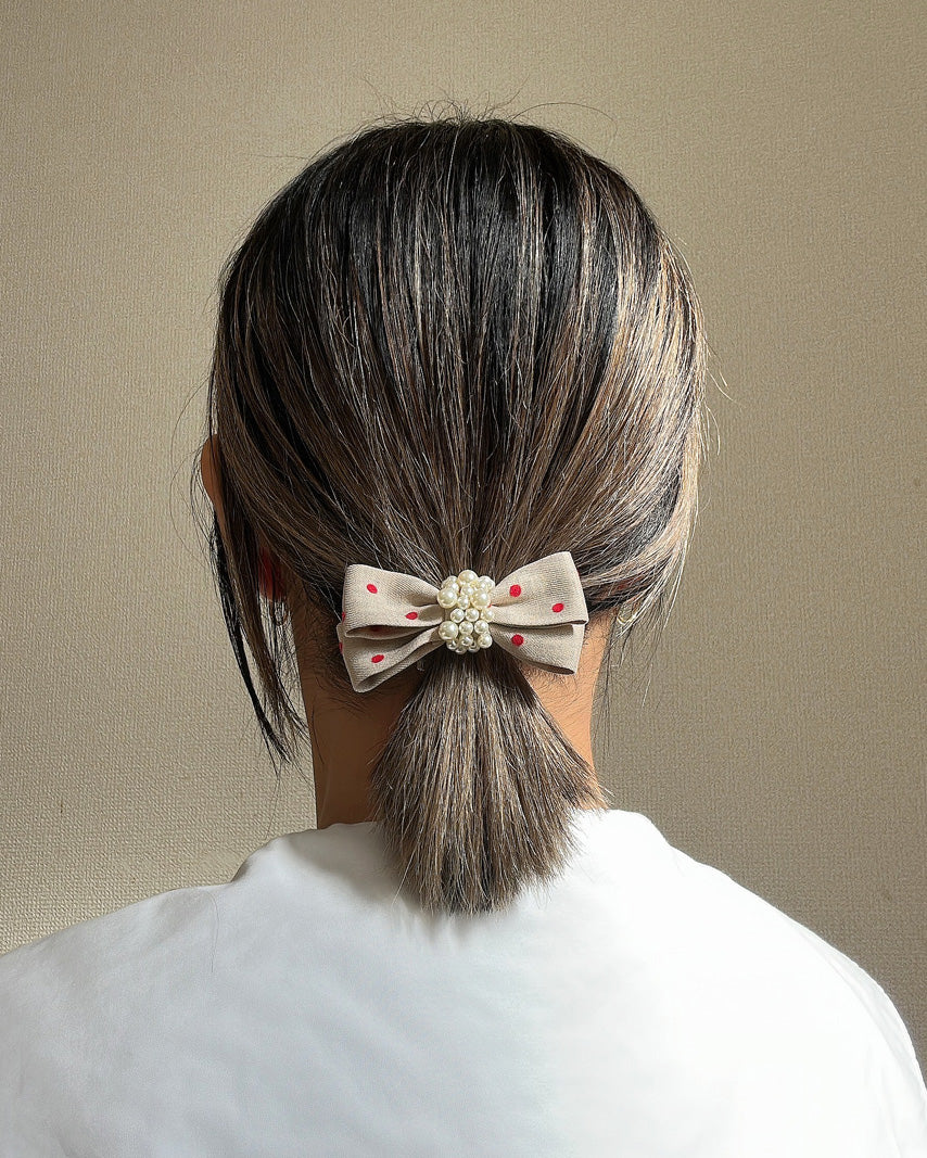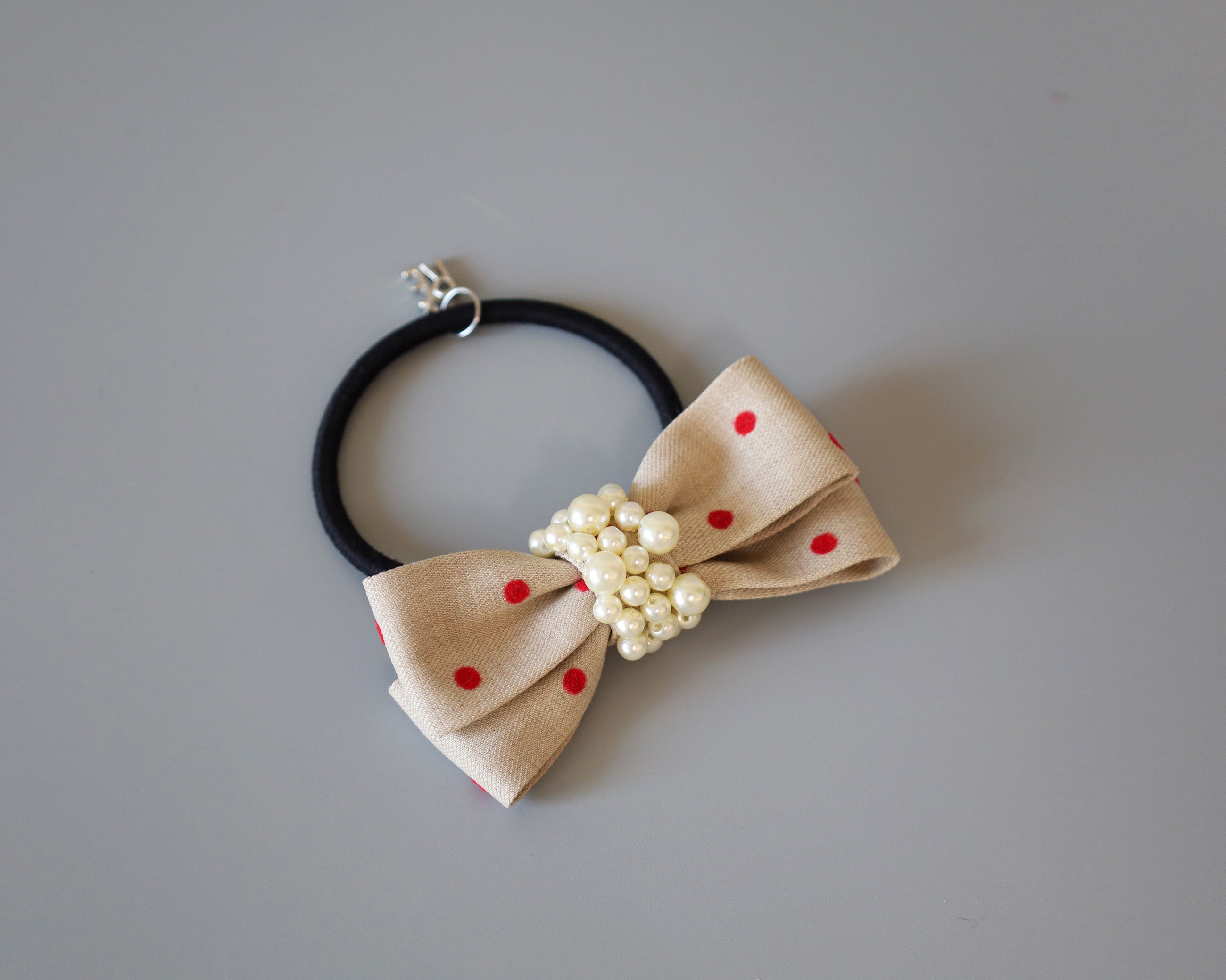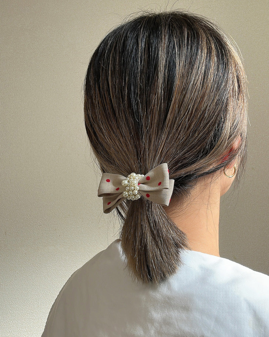 ホワイトベージュに赤のドットが映える、ポップな雰囲気が垣間見えるリボンポニー。